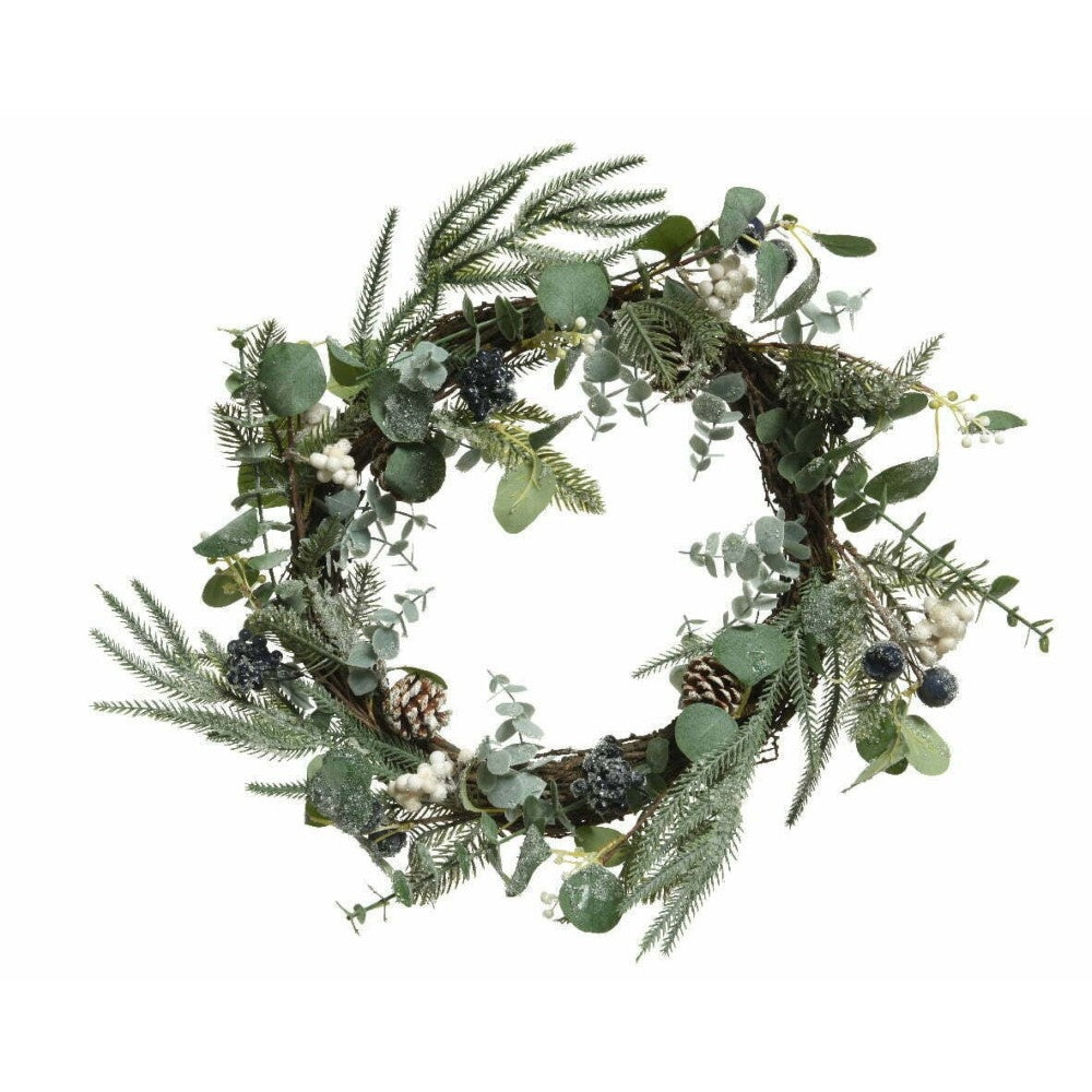 Add a touch of nature to your home with this 45cm Everlands wreath featuring beautiful eucalyptus leaves and berries. This stunning wreath is perfect for adding a festive touch to your front door, mantel, or even as a centerpiece for your table. The realistic design of the leaves and berries will bring the beauty of the outdoors into your home without the maintenance of real plants. Made with high-quality materials, this wreath will last for many holiday seasons to come. Bring the beauty of the outdoors into your home with this elegant Everlands wreath.