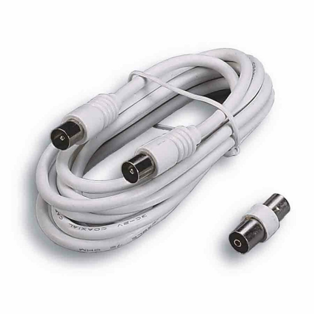 This extension cable for a TV antenna is 5 meters long and comes with an adapter for connection. This allows you to easily extend the reach of your antenna to improve reception and signal quality. Simply plug one end of the cable into your antenna and the other end into your TV or tuner to enjoy better reception and more channels. The adapter ensures compatibility with most standard connections.