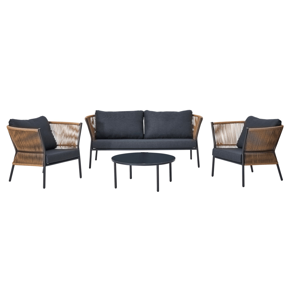 Fuji sofa set that includes 4 pieces, a K.D. structure made of steel with a powder-coated frame. The wicker is hand-woven with artificial rattan and comes with cushions for added comfort. The set also includes a coffee table with a glass table top. The whole set is finished with black zinc plating. The dimensions of the sofa are 176/84 x 78 x 73 cm, and the coffee table measures 70 cm in diameter and 35 cm in height. The set is packaged in cardboard and comes in 1 set per carton.