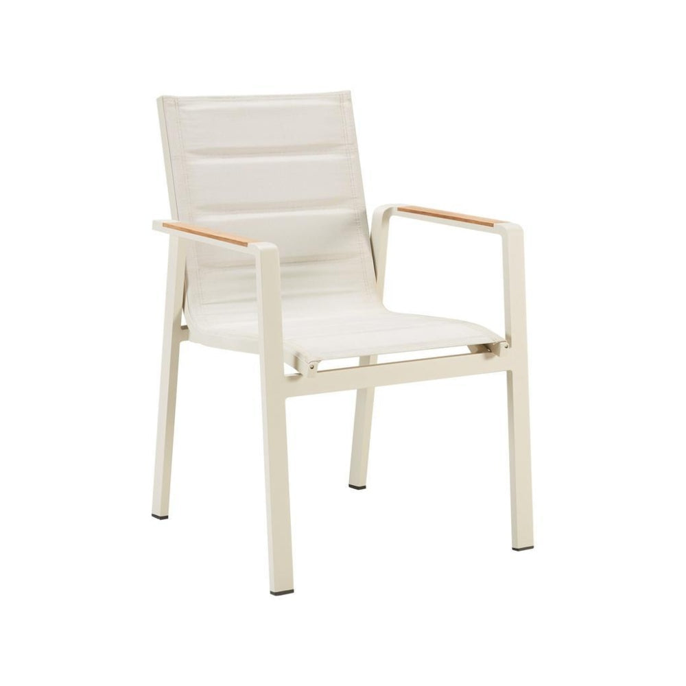 The Nofi 2.0 collection carries on the same design concept as the "mother" Nofi collection. Thanks to the light colors of the frame and cushions, it is the perfect piece of furniture for the garden of a home or hotel, the terrace of a modern-designed house, or the pool solarium of an elegant location. Cushions, as the main support in both the seat and back, have been replaced by the clever use of textilene, an innovative material of synthetic origin, synonymous with comfort and durability. Its main characteristic is its exceptional sturdiness, which ensures maximum hold against tearing and wear and tear. It is resistant to temperature changes, UV rays, salt spray, and chlorine, making it the ideal material for outdoor and garden furniture. In addition, padding has been added to the center to provide the same comfort as the cushions, giving added value to the entire collection. Materials: Powder-coated aluminum frame. Textilene seat and backrest with padding. Armrests with teak wood surface Dimensions: 64 x 59,5 x h 87 cm