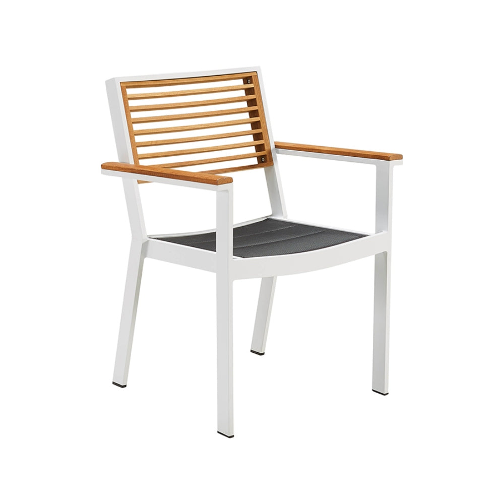 Using textilene, teak and white coating color to mix to make York very outstanding. The design is also very close to an indoor style.With a sharp color contrast in the sun, people can enjoy not only a beautiful sight but also a very warm feeling. Dimensions - 60 x 62 x 85cm