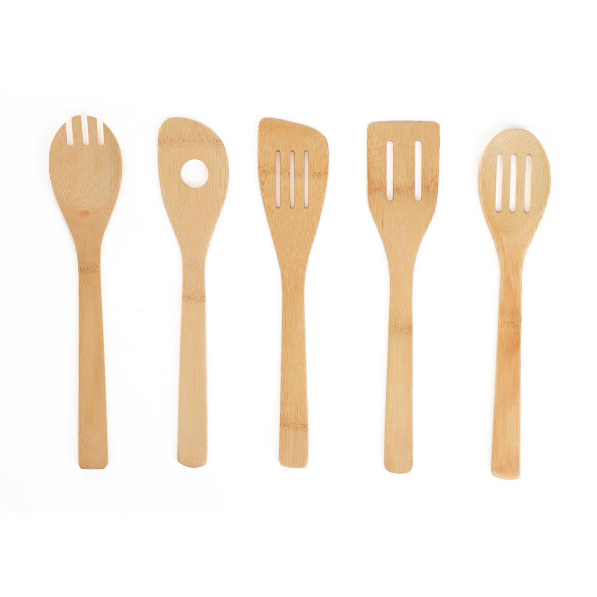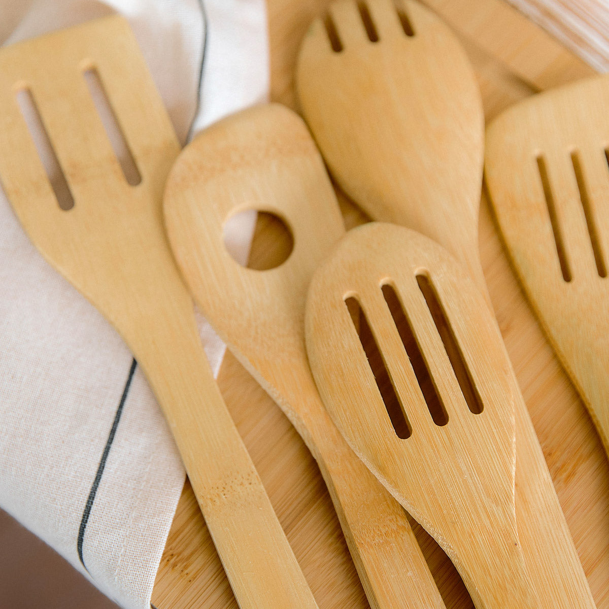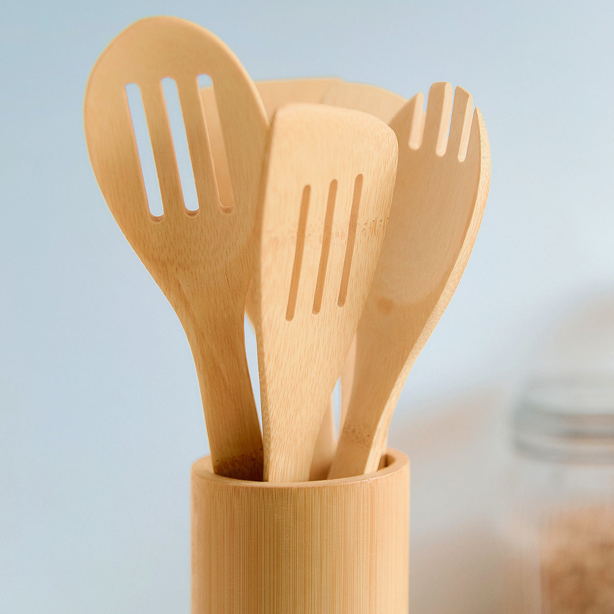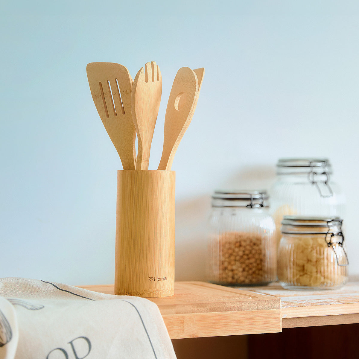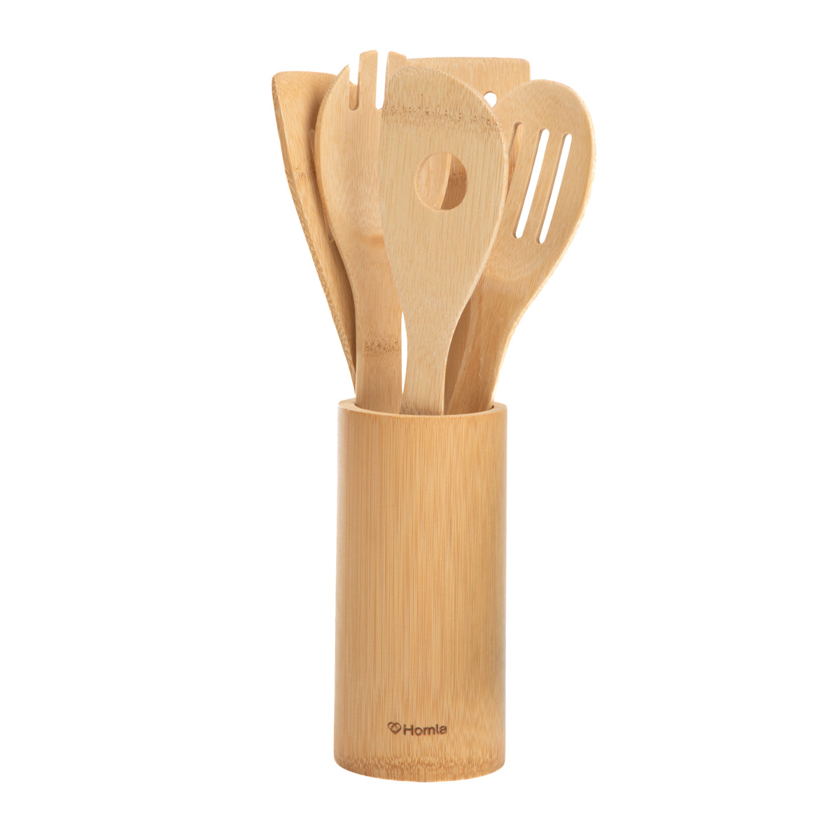 Comprises: 3 spatulas, spoon, fork, stand Natural Bamboo Bamboo kitchen accessories 6 pieces Cooking and serving food is much easier when you use good quality accessories. By reaching for BAMBOU accessories, you can be sure that you are using the highest quality utensils, natural and safest in contact with food. Thanks to the included container, you can easily store them. Placed in the kitchen, they will not only be functional equipment that is always at hand, but also a stylish decoration. Destiny The set consists of 6 elements. The fork and spoon are ideal for mixing and serving salads. You can use the spatulas when mixing ingredients and to turn fried products - meat, fish and vegetables. The holes in the spatulas allow for thorough draining before putting the prepared food on the plate. Material Natural bamboo provides accessories with durability and aesthetic appearance. Utensils should be washed by hand, after washing it is recommended to wipe them off. Thus cared for, they will serve reliably for a very long time.