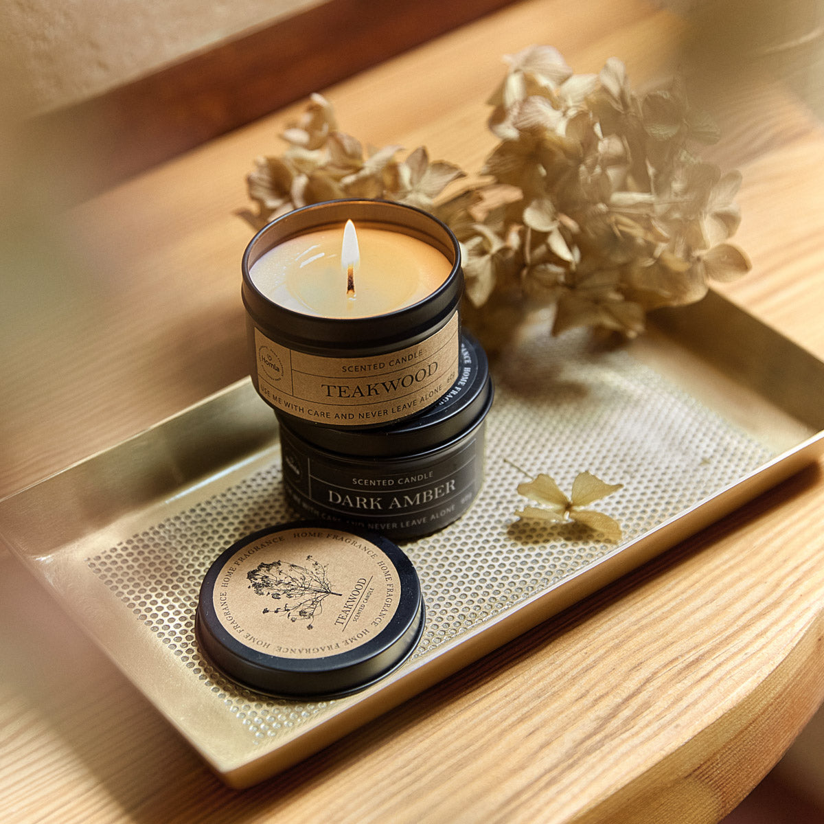 Beautiful teak fragrance Candle enclosed in metal packaging Scented teak candle Scent is one of the first stimuli that touch us when we enter a home. The HOMLA BILLY sc ented candle will help you to create a pleasant aroma inside your home. When lit, it fills the room with the intriguing fragrance of teak wood. The candle is housed in a metal container with a stopper, which allows it to be used safely and provides a beautiful setting. Purpose The BILLY candle will fill your home with the noble scent of wood, making you feel as if you were on a walk in the forest or park. It is perfect for placing in any room. You can light it every evening or save it for special occasions, such as a visit from guests or a romantic dinner. Material The paraffin wax used to make the candle is placed in a metal container with a stopper.