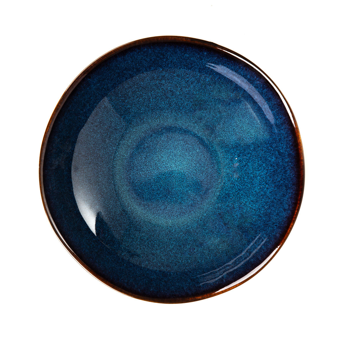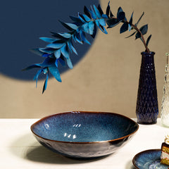 Diameter: 26 cm Durable and elegant stoneware Beautifully blending garnet shades Dishwasher safe Serving bowl navy blue 26 cm With the HOMLA CASPER stoneware serving bowl, you will be able to serve crispy snacks and salads elegantly during a visit to guests or a casual get-together with friends. The dish is navy blue in colour, which delights with its depth and blends seamlessly with the brown edge line. It will look great on a wooden table or against an elegant tablecloth. Purpose The CASPER bowl is perfect as a serving dish for all kinds of parties, celebrations and informal gatherings with family and friends. Use it to serve salads, eggs in mayonnaise sauce, freshly baked rolls and salad for dinner. It is also ideal for crisps and sweets. Material The bowl is made of high-quality stoneware, which is durable and scratch-resistant. It has a smooth surface, which makes it easy to keep clean. The bowl can be washed in the dishwasher. Each product of the CASPER series is unique due to the colouring technology. The unique pattern is applied using the reactive glaze technique, so the individual products may vary in shade, pattern and surface. Small indentations or holes on the surface are natural and result from the production process.