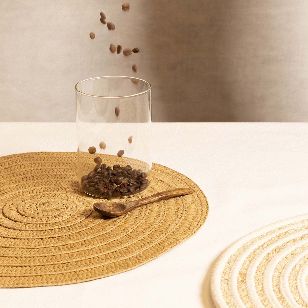 The CORD table pad has a diameter of 38 cm. It is a universal size that is perfect for meals, protecting the table from hot plates and drinks in dishes. The material creates an imitation of a braid arranged in even circles. The taupe color will suit modern, elegant interiors, but also, for example, the classic English style.