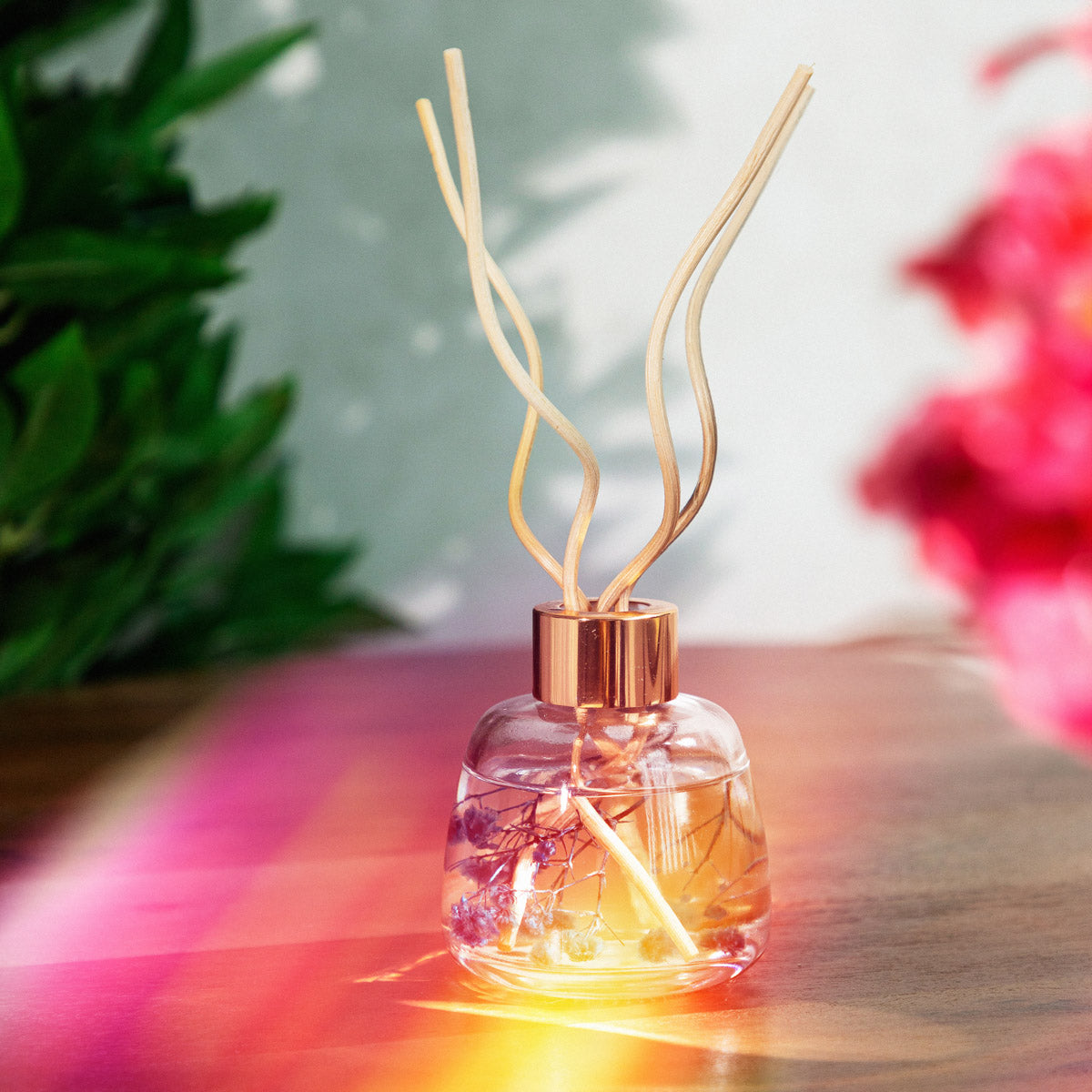 Unique floral notes Elegant design Easy to adjust the intensity of the fragrance Capacity: 120 ml Beautiful aroma diffuser The DREAMY BLOOM aroma diffuser is an excellent choice for those who want to bring the fresh and floral aroma of osmanthus into their interior. It is ideal for the living room, bedroom, bathroom and office, creating an atmosphere full of lightness and natural elegance that promotes relaxation and well-being. It is also a great gift for any lover of beautiful aromas. Destiny The DREAMY BLOOM diffuser is characterized by a subtle osmanthus scent that fills the space with a fresh, floral aroma, introducing a feeling of natural lightness and elegance. It contains high-quality fragrance oils that provide a long-lasting aroma release, keeping the scent fresh for weeks. A transparent bottle with an elegant gold stopper, equipped with decorative, twisted sticks, adds a modern and stylish touch to the whole. Material The diffuser's scent is created by water and fragrances added to it. The mixture is enclosed in an elegant bottle.
