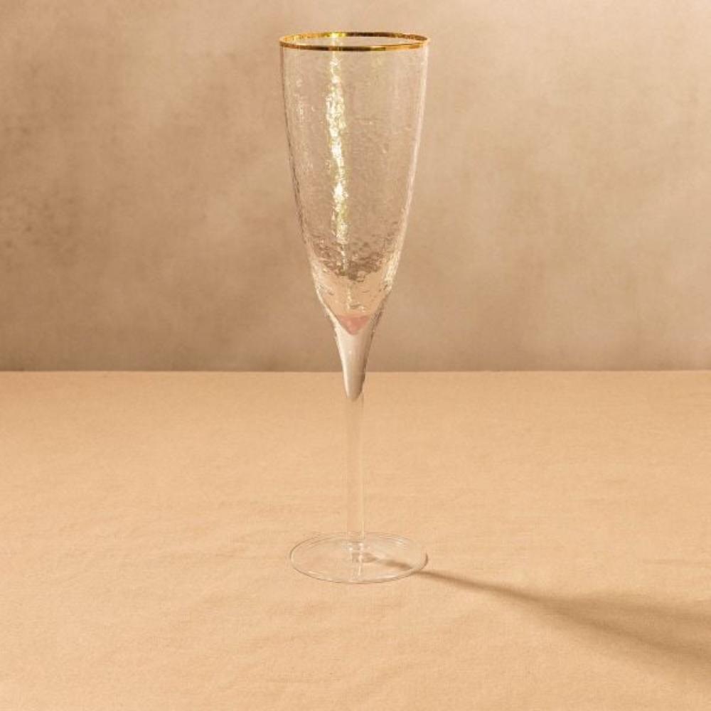 Champagne is only opened when something special happens. Life's landmark moments deserve an extraordinary setting. This can be provided by the ESTELLA champagne glass . Filled with sparkling, golden liquor, it will look beautiful - just the kind of accessories the most important toasts need. Purpose Thanks to the fact that ESTELLA champagne glasses are available by the piece, you can buy exactly as many as you need without cluttering up your home. Their most spectacular decorative element is the gold stripe that has been placed around its rim. In the interests of ensuring that it does not lose its colour and shine, only wash the glasses by hand. Wine glasses and glasses are also available in the ESTELLA series . Features The ESTELLA champagne glass has a classic inverted cone shape. It has a round base and a long, slender leg. Its capacity is 0.25l . It is made of clear, colourless glass and its walls have an interesting texture that creates a nice decorative effect. Its rim is decorated with a gold stripe . Material The glass is made entirely of glass .
