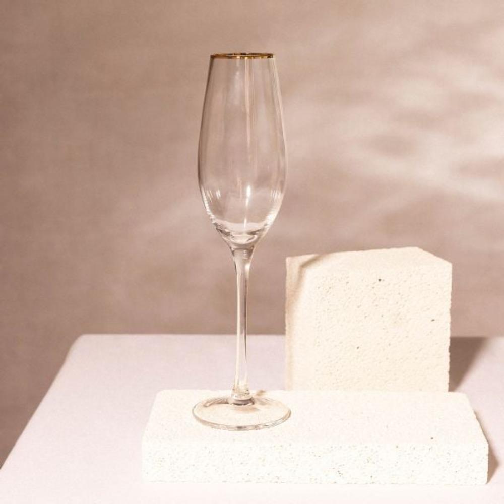 Purpose FELICE transparent champagne glass is a piece of glass tableware that should be found in every home. Designed for champagne, it will come in handy for special occasions and lavish celebrations. Features The classic and universal transparent colour is complemented by gold ornamentation of the rim, which adds a unique character to the whole. The slender glass with a capacity of 0.24 l is set on a long leg and a stable base. Material High-quality glass will provide an appropriate setting even for dry spirits. The robust material does not absorb odours. The glass should be washed by hand.