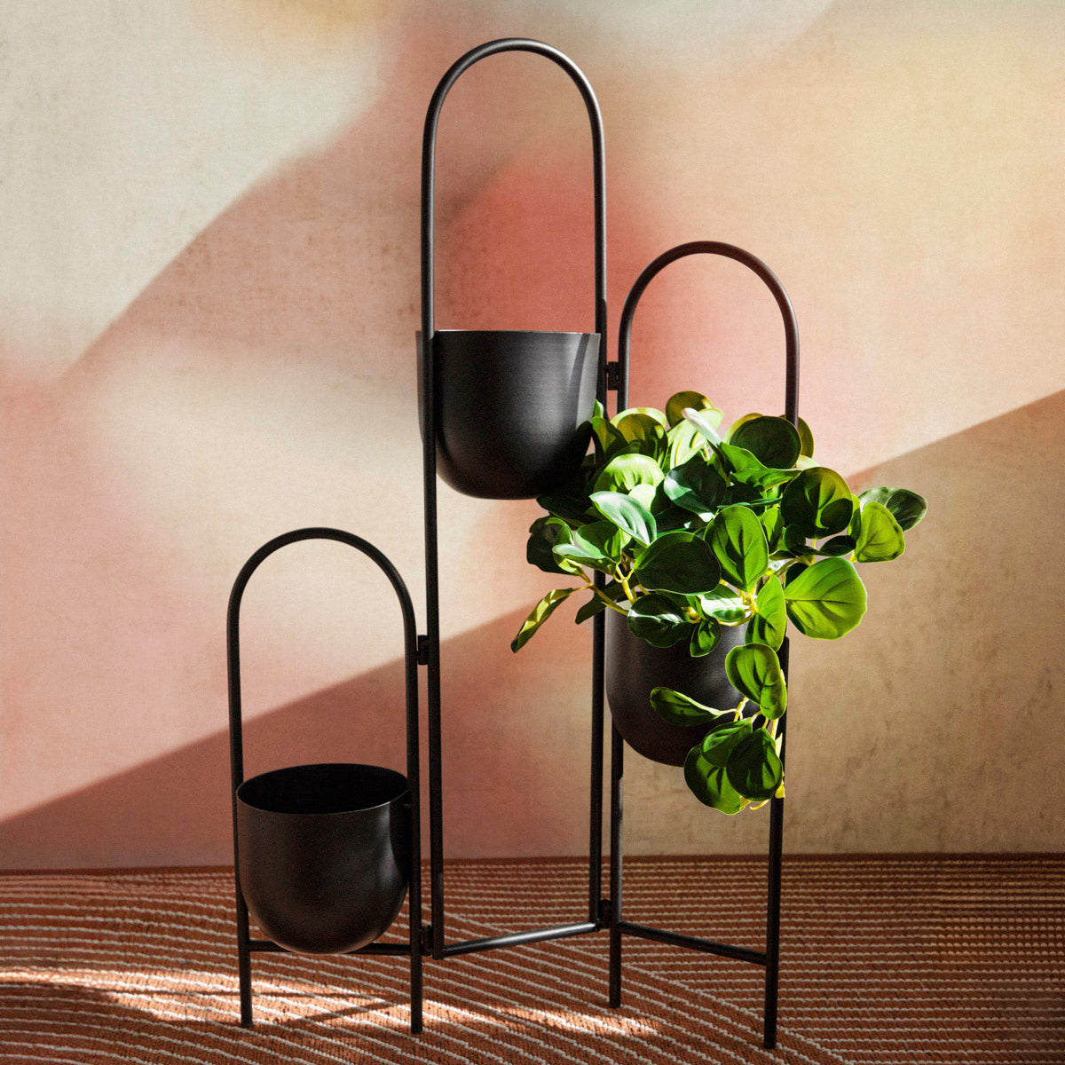 Places for pots to act as stylish covers Allows you to beautifully display plants in any room Stable construction ensures the safety of the flowers Black colour harmonises perfectly with green foliage Black standing metal flowerbed Create a special place for your plants by placing them in the HOMLA FLOERO metal flowerbed. The pot spaces are arranged at different heights, making it ideal for displaying standing and hanging plants. The black frame harmonises perfectly with the green foliage, providing a minimalist backdrop for them without stealing all the attention. It will make alcove plants on windowsills and side shelves the real stars of your décor. Purpose You can place 3 plants in the FLOERO flowerbed. The places for the flowers serve as stylish covers, thanks to which the whole looks very coherent and you don't have to worry about the appearance of the pot. The flowerbed is not only an additional place for plants, but also a stylish decoration of the interior. It fits perfectly into minimalist, loft, eclectic and urban jungle spaces. The flowerpot holder is 14 cm in diameter and 14 cm high. Material The flowerbed is made of high quality metal. Its structure is stable, and the metal used is durable and resistant to mechanical damage. You can easily keep it clean by occasionally wiping it with a damp cloth.