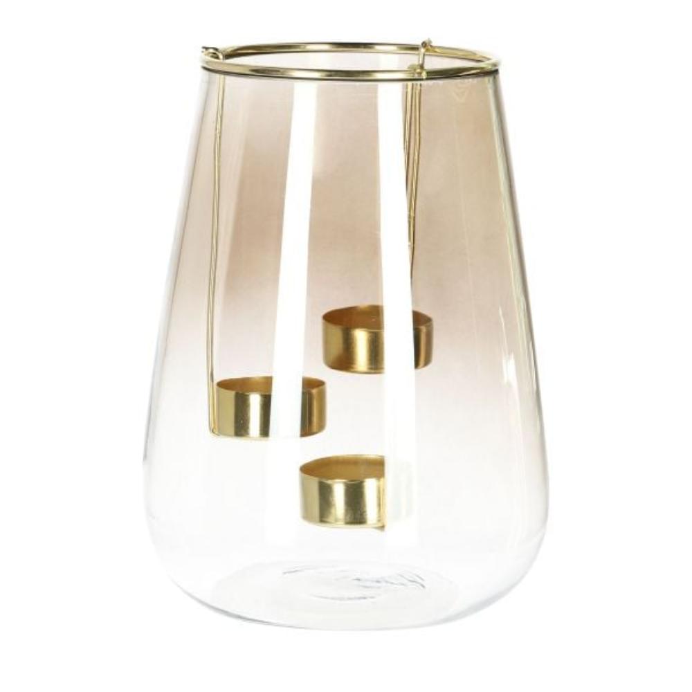 Often the simplest solutions work best. This is undoubtedly the case with the GALIA lantern . This very minimalist, ingenious and easy-to-maintain lantern will enhance any gathering in your home and give it a pleasant atmosphere, illuminating the faces of your loved ones with soft candlelight . Purpose The GALIA glass lan tern is designed in such a way that it can be successfully used both indoors and outdoors. It should be lit with tealight cand les. The lantern consists of two parts, which are very easy to disassemble - then you can clean it without any problems. The removable frame also allows you to light the candles conveniently, without burning your fingers or spilling paraffin . Features The decorative GALIA lantern is made up of two elements - a glass diffuser "smoked" in pink and a golden metal frame . It has space for three tealight candles . The whole has dimensions of 15x15x20cm . Material The lamp shade is made of glass and the frame inside is made of metal .