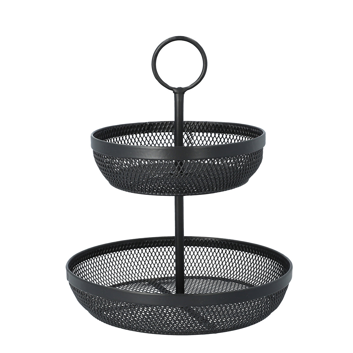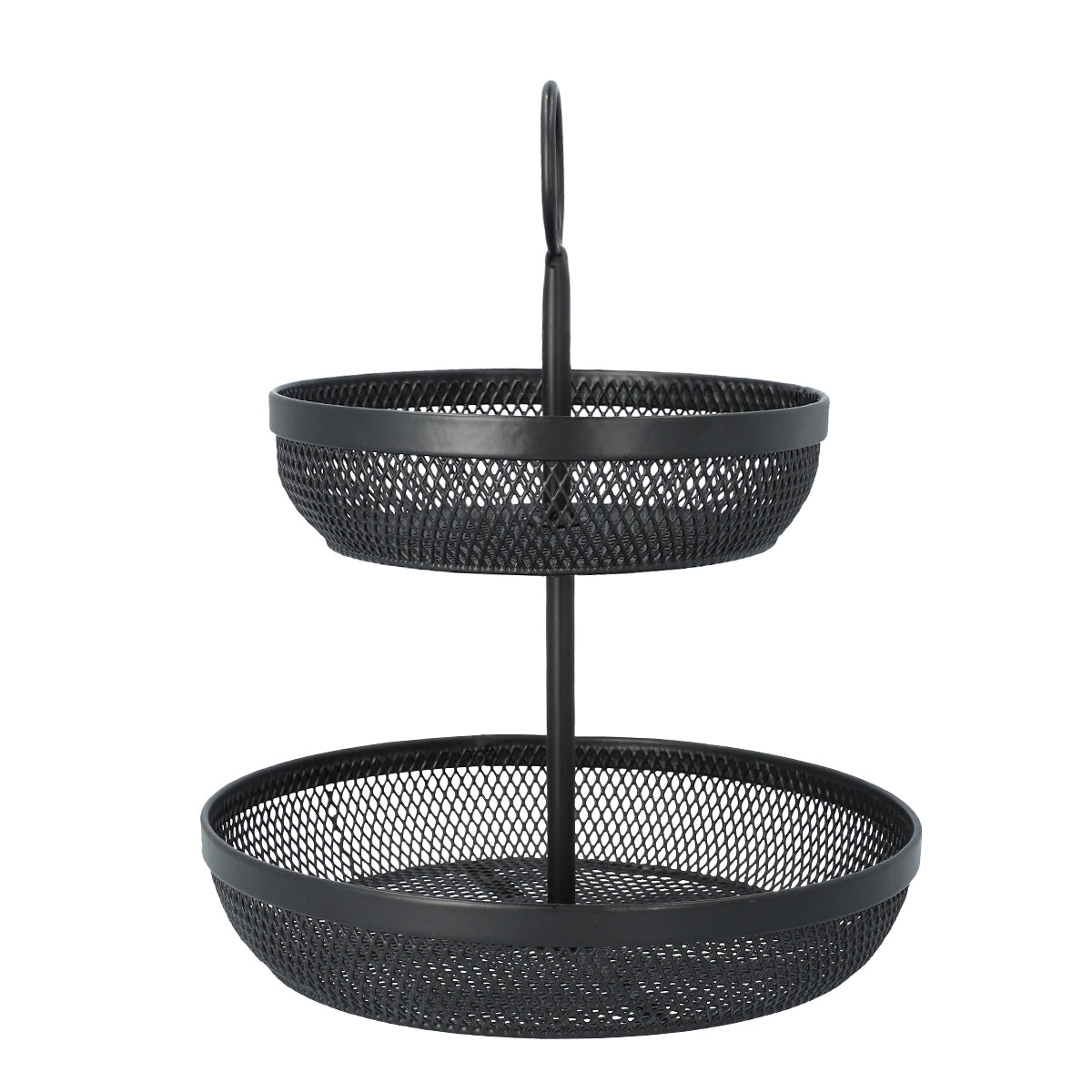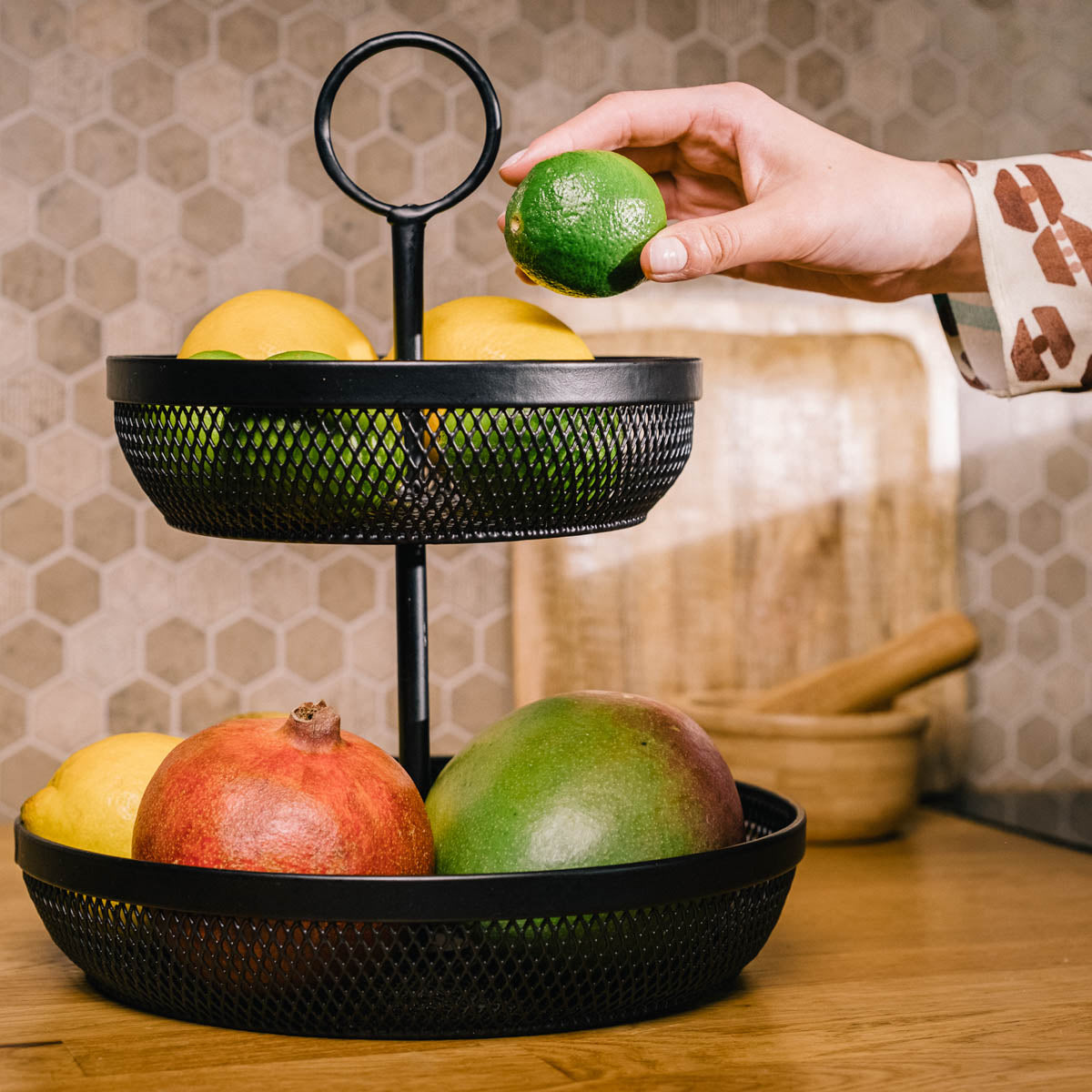 Purpose The GRIDIO double-decker basket is the perfect product for displaying fruit, sweets, or small snacks. Regardless of whether you place it on the dining room table, in the living room on the dresser, or on the kitchen counter, the basket will look great. With the practical GRIDIO basket, your favourite fruit and vegetables will always be close at hand. Features The GRIDIO basket has two tiers - decreasing in height. These are circular bases in which we can place various delicacies. The bases have higher edges, so we don't have to worry about anything falling out of the basket! You can serve all kinds of fruit in it in a stylish and functional way. Take care of your loved ones and tempt them with a juicy pear or a delicious pomegranate. Material The GRIDIO basket is made of metal painted black. The product measures 31 (H) x 26 (D) cm. The high quality of the materials and precision workmanship have made the basket durable and impeccable looking.