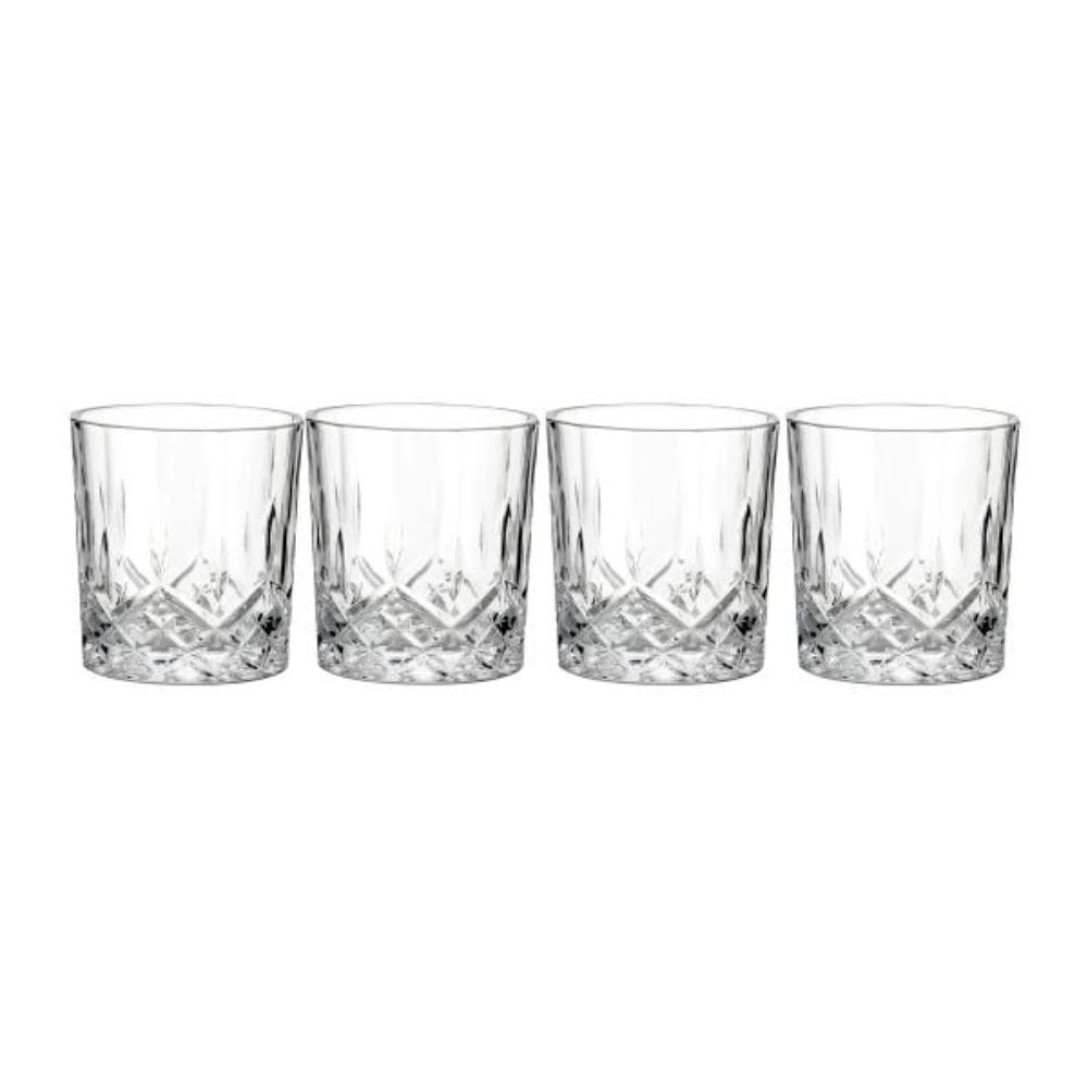consists of 4 glasses with a cylindrical shape. The bottom of the glasses features embossed geometric patterns . The transparent colour of the product will allow you to match them with your tableware without any problem. Elegant glasses complemented with colourful cocktails, drinks or soft drinks will look nei-sophisticated. The set may also prove to be a good gift idea.