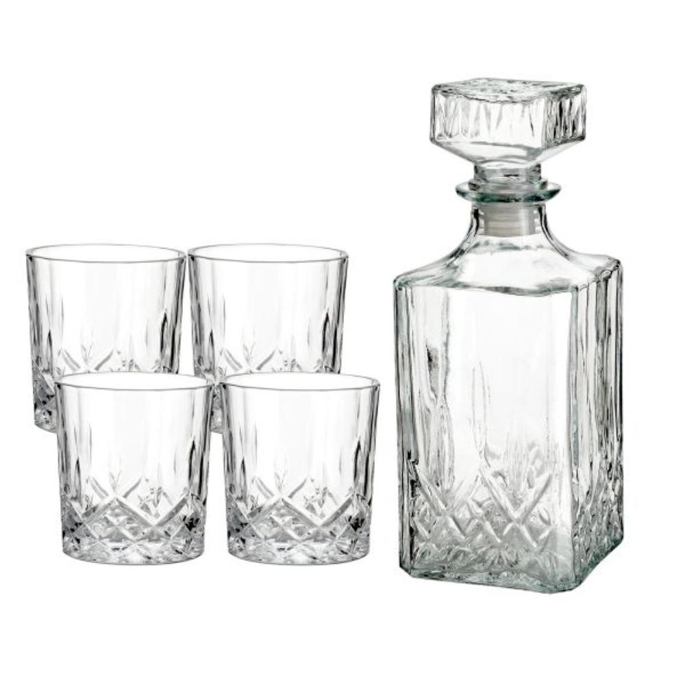 The set includes a beautiful, slim carafe with a capacity of 0.95 l , which fits securely in your hand, and 4 glasses with a capacity of 0.2 l . All vessels are made of transparent glass , decorated with unique grooves with a plant motif . The carafe is perfect for serving liqueur, whiskey and juice on summer afternoons.