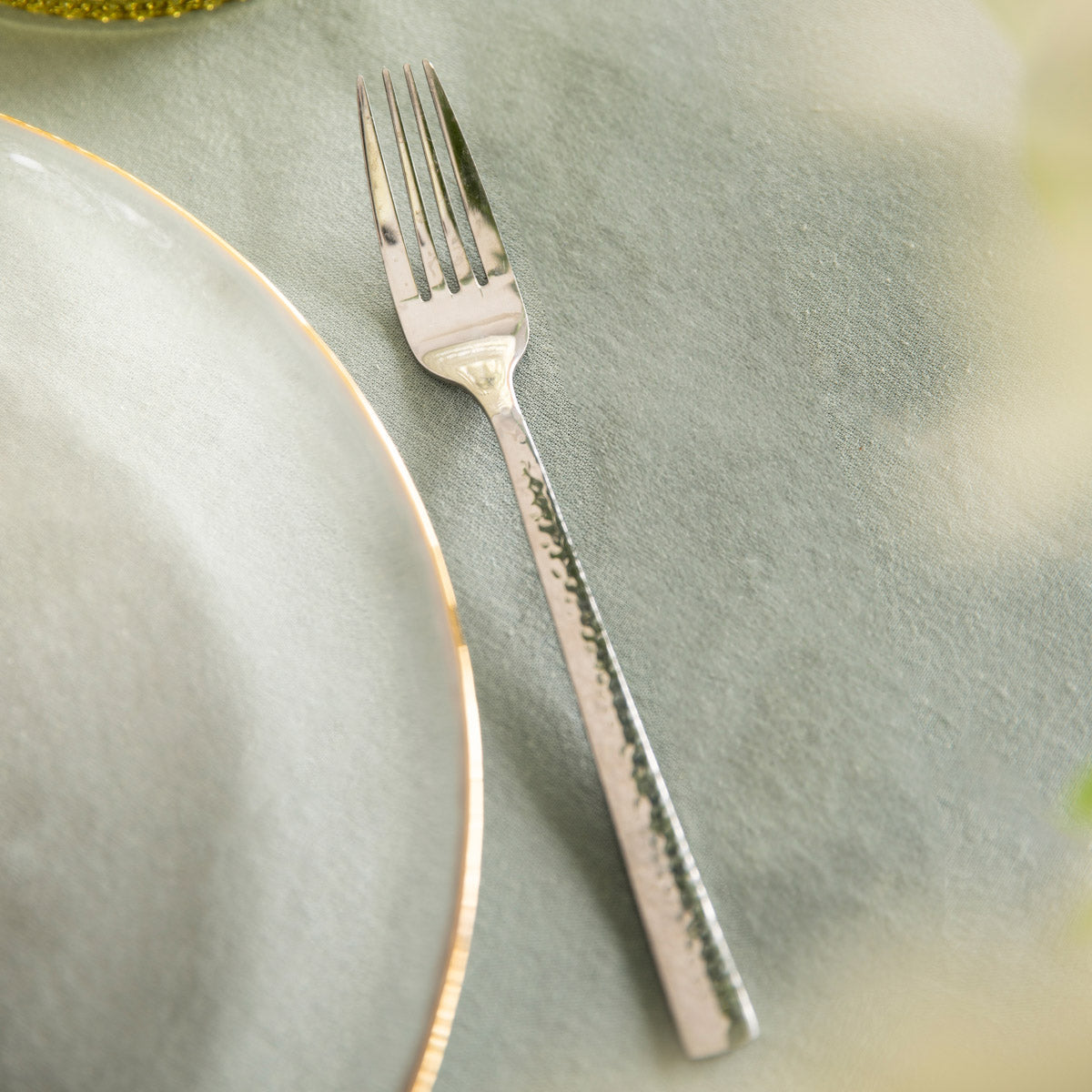 Purpose An essential kitchen accessory, the cutlery is made with care and guarantees long-lasting use and satisfaction. Cutlery from the MARTELLO line is available as a set or by the piece, so you can individually adjust the right amount for you. Features With its subtle rounded lines, glossy coating and hammered handle, the dinner fork will match both traditional and contemporary tableware. Each piece has been made with the utmost care and attention to detail. The fork is set in silver and measures 20 cm in length. Materials The MARTELLO fork is made of stainless steel. The material is hygienic, resistant to damage and corrosion, so we can be sure that the cutlery will not lose its attractive appearance despite intensive use. The fork can be washed in the dishwasher.
