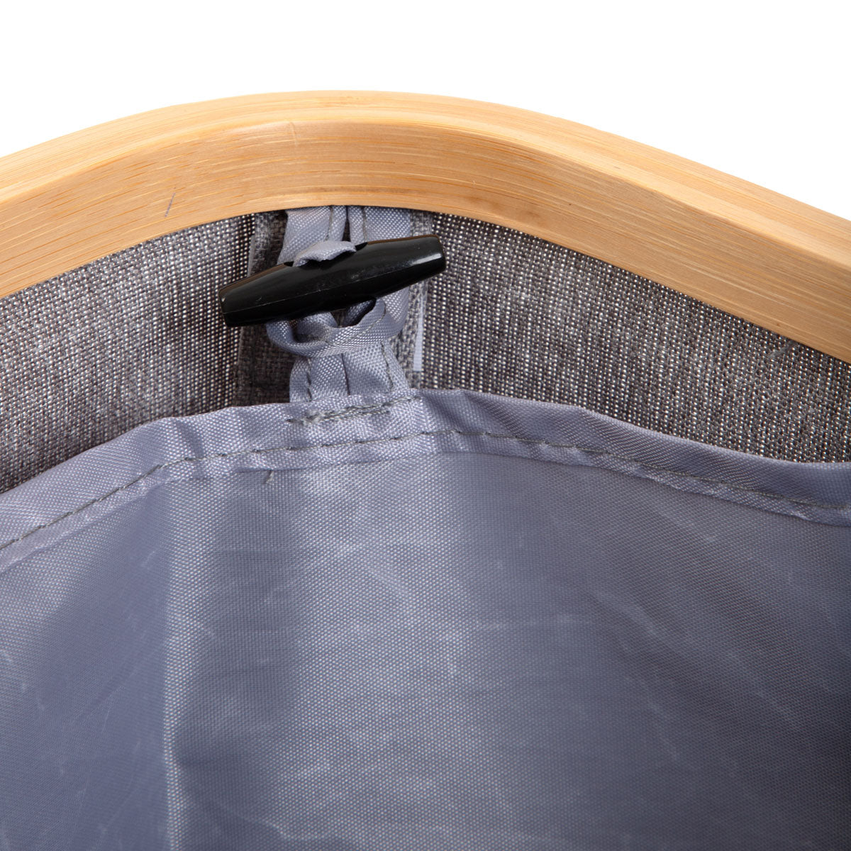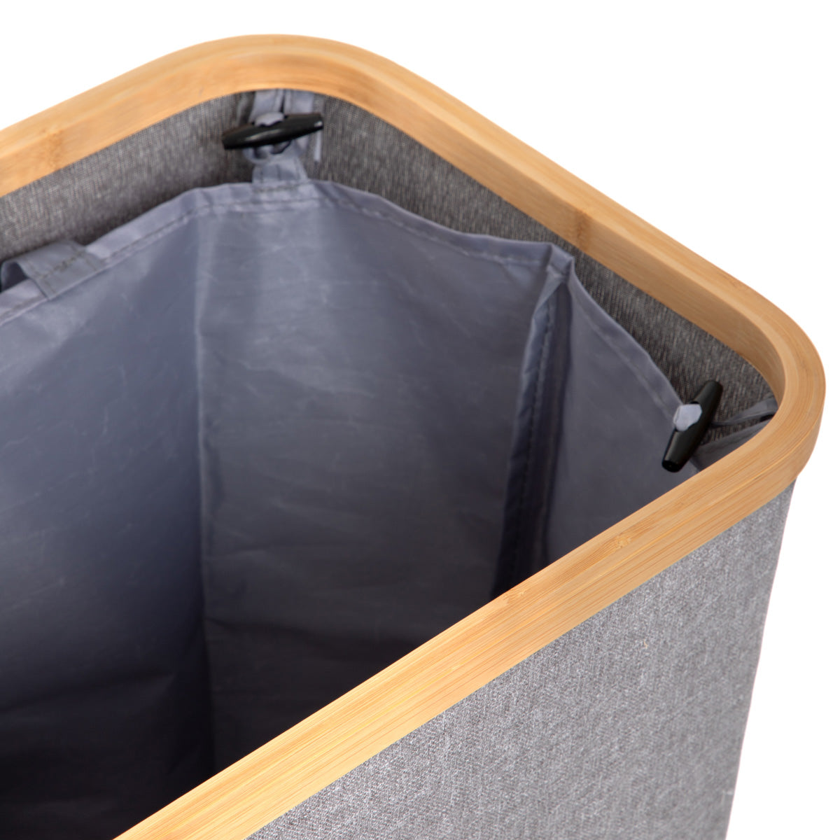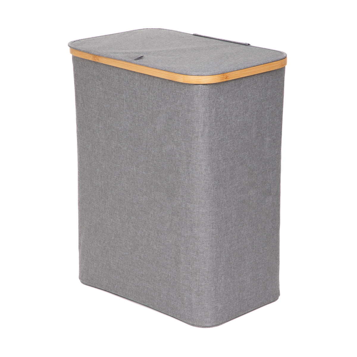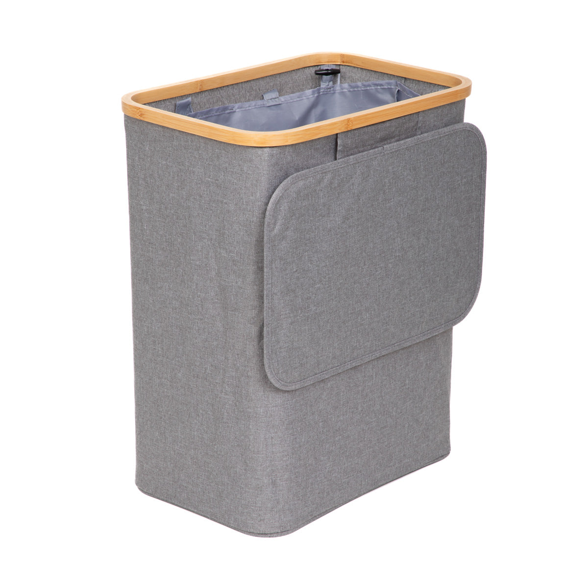 Lid with discreet handle Pull-out cartridge Modern design Ideal for the bathroom or bedroom Laundry basket grey with lid The NELLIE laundry basket is not only a practical piece of home equipment, but also a stylish addition to your bathroom or bedroom. The modern design, which is due to the combination of grey and warm wood accents, makes it perfectly presentable and a great complement to your décor. The lockable lid hides its contents so that the room is tidy and nothing disturbs the harmony of the décor. Purpose The NELLIE hamper is perfect for storing laundry. You can put all your clothes in it, or just those of a light or dark colour. Inside the hamper you will find a removable insert, thanks to which you can easily move the contents near the washing machine. It will fit perfectly into modern, Scandinavian, boho and loft style interiors. Material The basket has a stable frame and its walls are made of durable material.