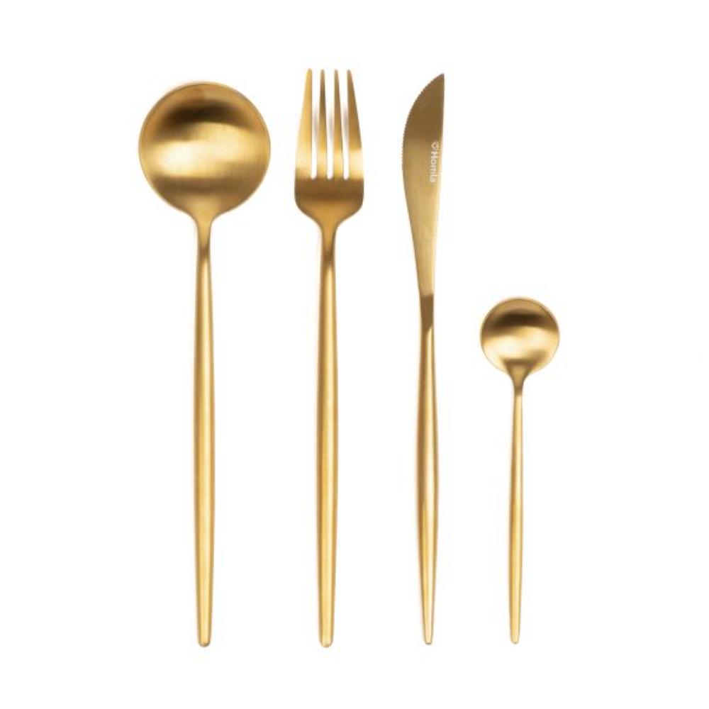 High-quality stainless steel 16 pieces in a set Practical set of gold cutlery Add an elegant touch to your table with NOIA gold cutlery. Made of high-quality stainless steel, in a matte gold finish, they will be a perfect decoration for any table. This practical set contains 4 knives, 4 forks, 4 tablespoons and 4 teaspoons, making it a complete set for serving a variety of dishes. Destiny NOIA cutlery is an excellent choice for people who appreciate elegance and style on their table. The set contains everything you need to serve meals for both everyday dinners and special occasions. The matte gold adds a modern charm to them, and the ergonomic shape ensures comfort of use. Material The cutlery is made of high-quality stainless steel, which is characterized by exceptional durability, strength and resistance to damage. Hand washing is recommended.