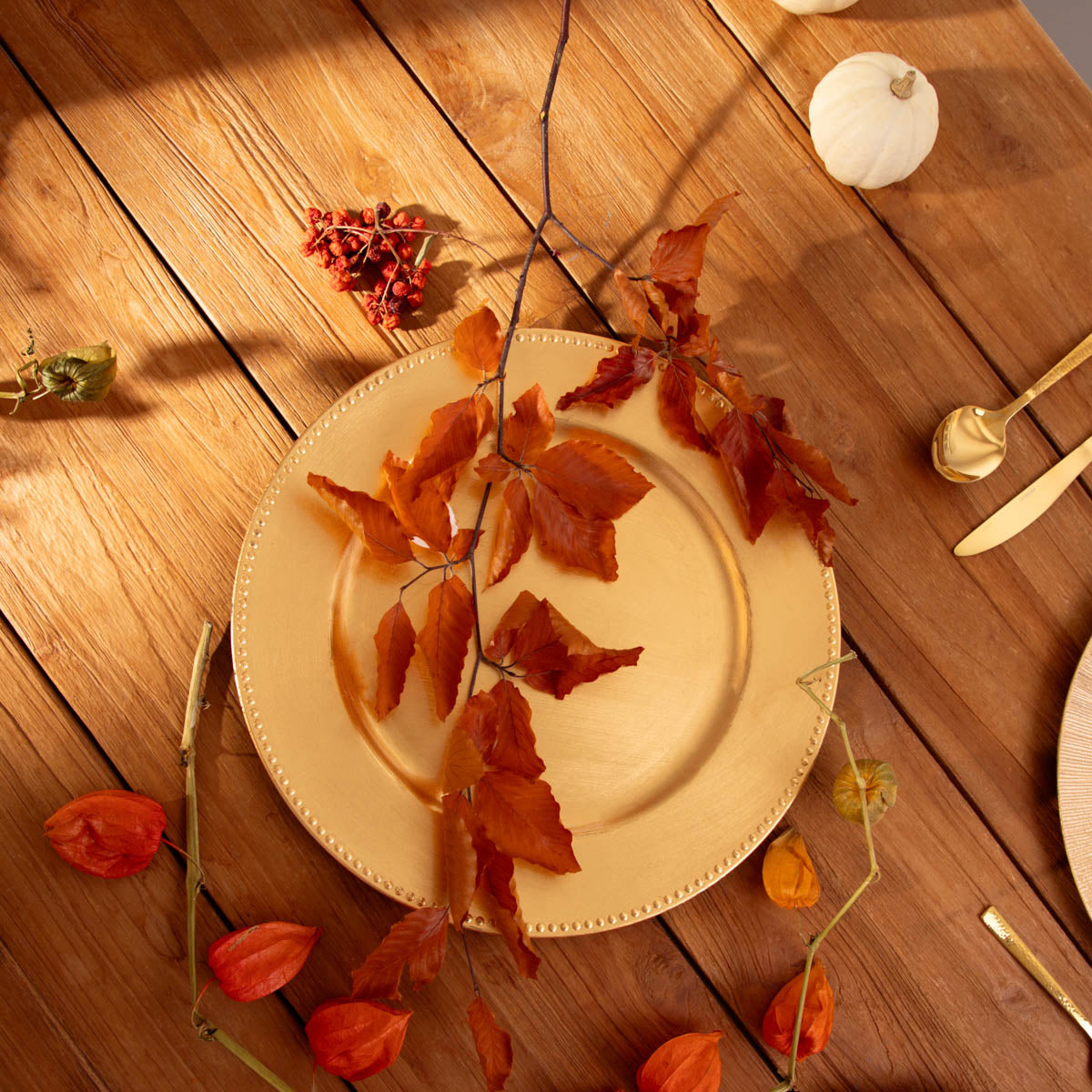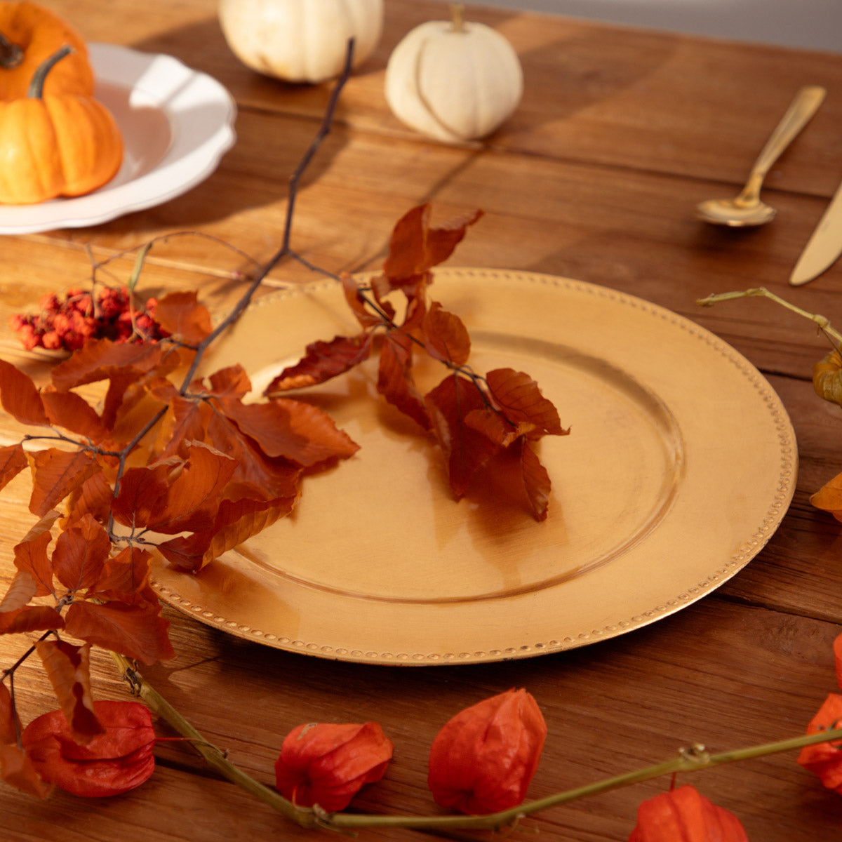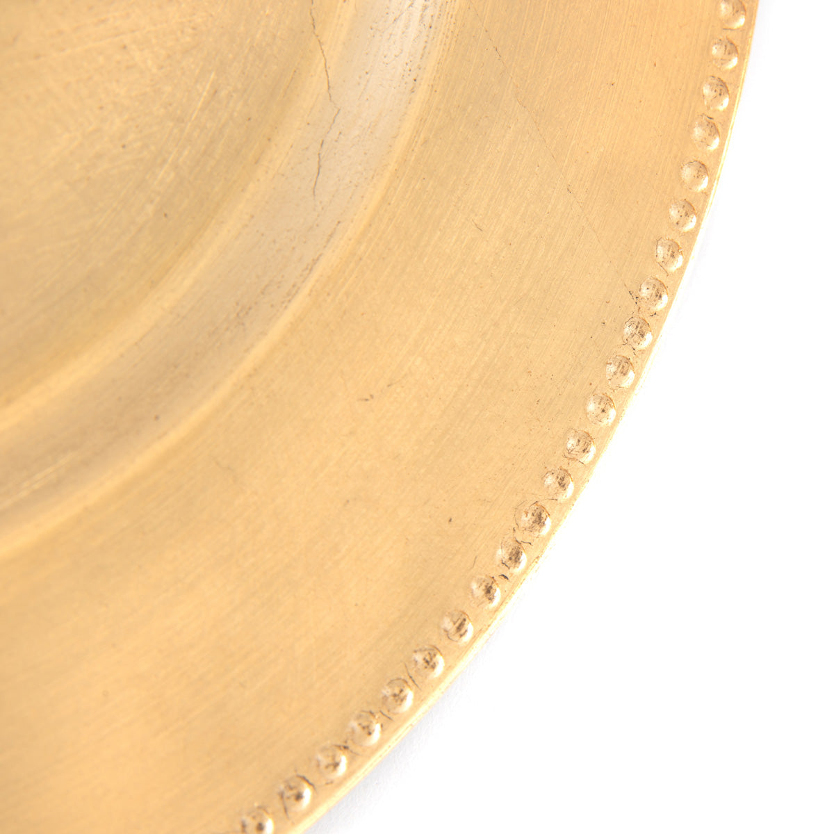 Destiny Are you of the opinion that a little glamour never hurt anyone? Then you will certainly like the PLAST decorative tray in royal gold. It will be suitable both as a serving utensil for guests and for special occasions (e.g. Christmas Eve table), and as a decorative element in the dining room or kitchen. You can combine it with crockery in muted colours - classic, elegant white, deep navy blue or timeless black. Features The tray with a diameter of 33 cm is a large dish that can be used to serve small snacks or exquisite dishes. In its minimalist form, it is distinguished by its decorative wide rim , as well as its decorative structured decoration of small beads. It has been painted in an elegant gold colour , which harmonises perfectly with the light in the rooms. Material The tray is made of ceramic painted in gold. It is highly resistant to scratches and damage.