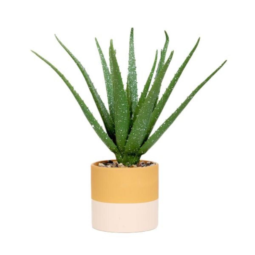 A beautiful decoration for any interior Realistic plant depiction High-quality plastic Height: 32 cm Beautiful artificial aloe vera plant Bring a touch of nature into your home with the beautiful SEMELA plant. Created for a fast-paced lifestyle, where caring for real plants can be a challenge, it is an extremely practical yet elegant choice that will perfectly fit into various interior design styles. Destiny Ideal for any space, from the office to the living room, the SEMELA plant does not need light or water, yet it always looks fresh and attractive. Careful reproductions of aloe vera and an elegant, two-color pot create a stylish decoration that fits both modern and classic interiors with its design. Material The plant is made of high-quality plastic, which is characterized by exceptional durability, strength and resistance to damage.
