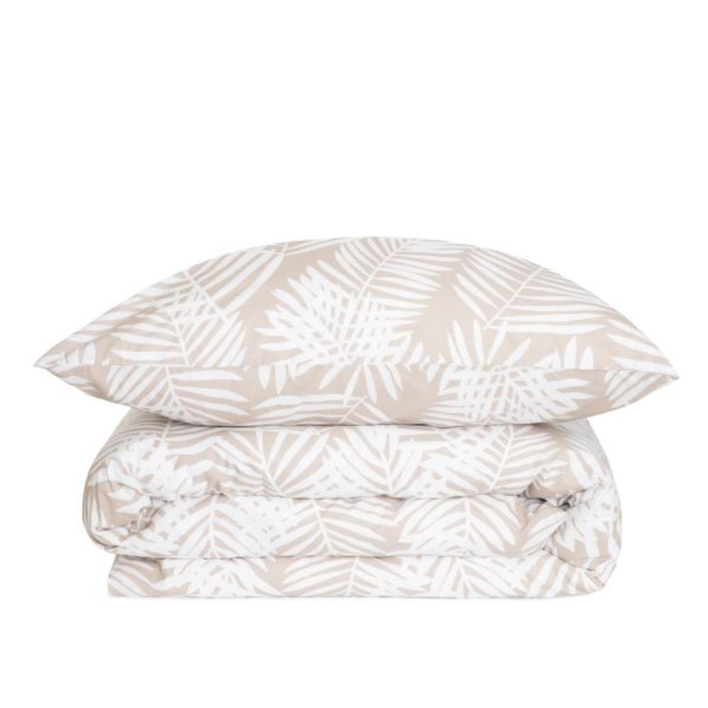 Set of duvet covers and 2 pillowcases Soft and airy cotton Zip hidden under the tab Dimensions: 160 x 200 cm Set of pillowcases in white leaves 160x200 cm Pleasant to the touch, airy and yet durable - this is exactly what FYLLO cotton bedding is. The beige pillowcases are decorated with a pattern of white palm leaves, making them look very stylish. Made from natural cotton fibres, it will pleasantly wrap you in its softness and create the perfect sleeping environment. Purpose The bedding includes a duvet cover 160 x 200 cm and 2 pillowcases 70 x 80 cm. Subdued colours and the motif on the bedclothes make it fit perfectly into boho and Scandinavian style interiors. During the day it will be a beautiful setting for your bed, and at night it will guarantee you a comfortable night's sleep. Material FYLLO bedding is made from high-quality cotton, which is pleasant to the touch and airy. The material is also characterised by its durability - it is resistant to fading, colour loss and abrasion. The pillowcases are closed with zips, so you can easily fill them with duvets and pillows.