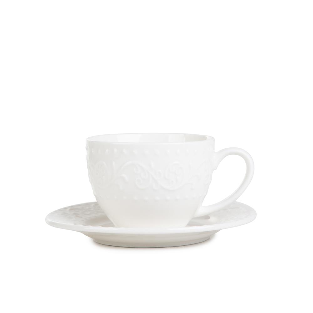Capacity: 90 ml High-quality porcelain Beautiful convex ornament Dishwasher safe Porcelain cup with saucer white 90 ml The HOMLA SYLIA porcelain cup will allow you to serve espresso in an elegant way. It is kept in white and its surface is decorated with a convex ornament inspired by floral motifs. The cup comes with a plate, with which it creates a coherent and extremely stylish set. It will look great on the table during family parties and meetings with a friend. Destiny The SYLIA cup has a capacity of 90 ml, making it ideal for serving aromatic espresso. It has an ear that allows it to be held comfortably in your hand and safely enjoy the taste of a warm drink. In addition to a cup, the plate will also fit a sugar cube, a spoon to stir the coffee and a small cookie. Material The cup and plate are made of porcelain with a hard and shiny surface. The set is dishwasher safe.