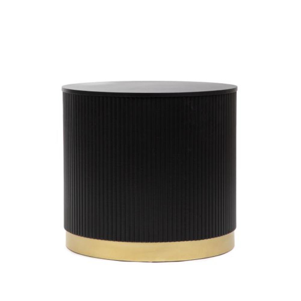Concealed Storage Container Decorated with stylish grooves Durable and durable Ideal for the living room or bedroom Coffee table with container black The stylish HOMLA TABI coffee table impresses with its elegant design and carefully refined details. It has a round shape and its sides are covered with beautiful grooves. Under the removable table top, we have placed a storage container in which you can hide snacks, a blanket to cover yourself on cold evenings or additional pillowcases. The table will look great in the company of a sofa and an armchair, creating a nice and comfortable corner to relax. Destiny The TABI side table is perfect for the living room, where you can comfortably place cups of coffee and a plate of snacks when a friend visits. You can also use it as a bedside table for the bedroom. TABI is kept in black with a matte finish, and the elegance is added by a golden belt. It will fit perfectly into stylish modern spaces and luxurious glamour interiors. Material The table is made of MDF board, which is durable. The smooth surface makes the table easy to keep clean. Additional information Diameter: 40 cm Height: 36 cm