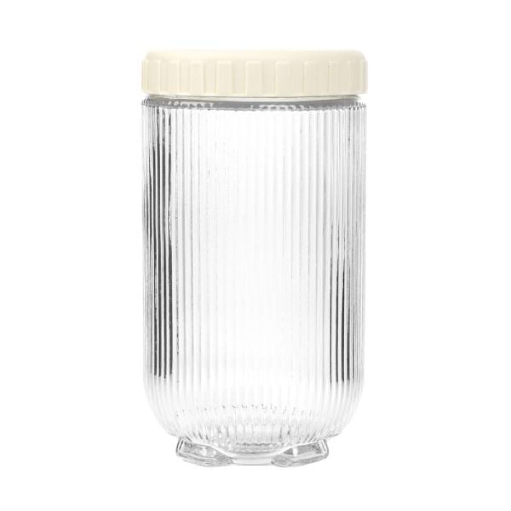 _x000D_ A practical addition to the kitchen or bathroom _x000D_ Capacity: 0.9 litres _x000D_ _x000D_ Multi-purpose container with a cream cap _x000D_ Add a practical utensil to your kitchen in the form of the TENZO container. This eleganill work perfectly with any kitchen equipment. Not only is it a great place to store products, but it is also a beautiful decorative element that will blend in perfectly with any interior design, from modern to traditional. _x000D_ Purpose _x000D_ ntainer is the perfect combination of practicality and classic design, complemented by a cream accent. Its 0.9 litre capacity is ideally suited to your kitchen needs, allowing you to store a generous portion of your favourite ingredients, from aromatic coffee beans to homemade pasta. The grooves on the jar are visually appealing and diffuse light beautifully, creating an elegant display on your kitchen counter. _x000D_ Material _x000D_ The container is made of durable, transparent glass, whichrised by exceptional strength, durability and aesthetic appeal.