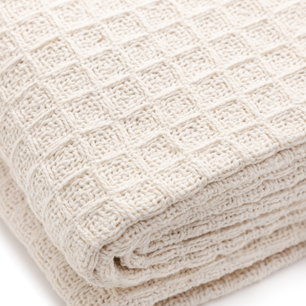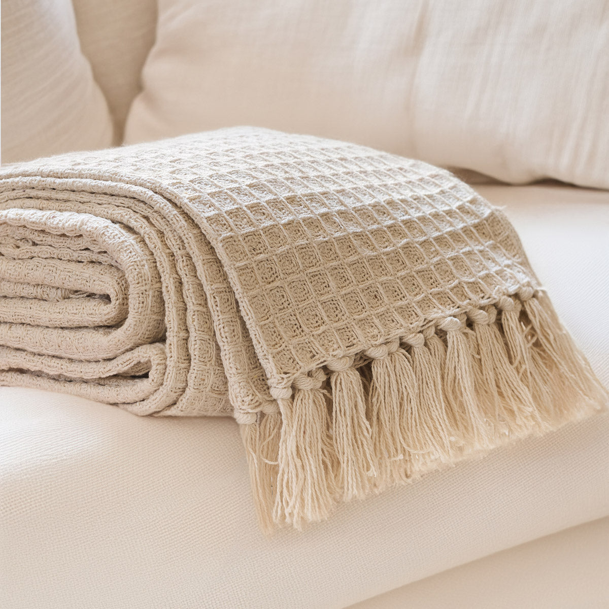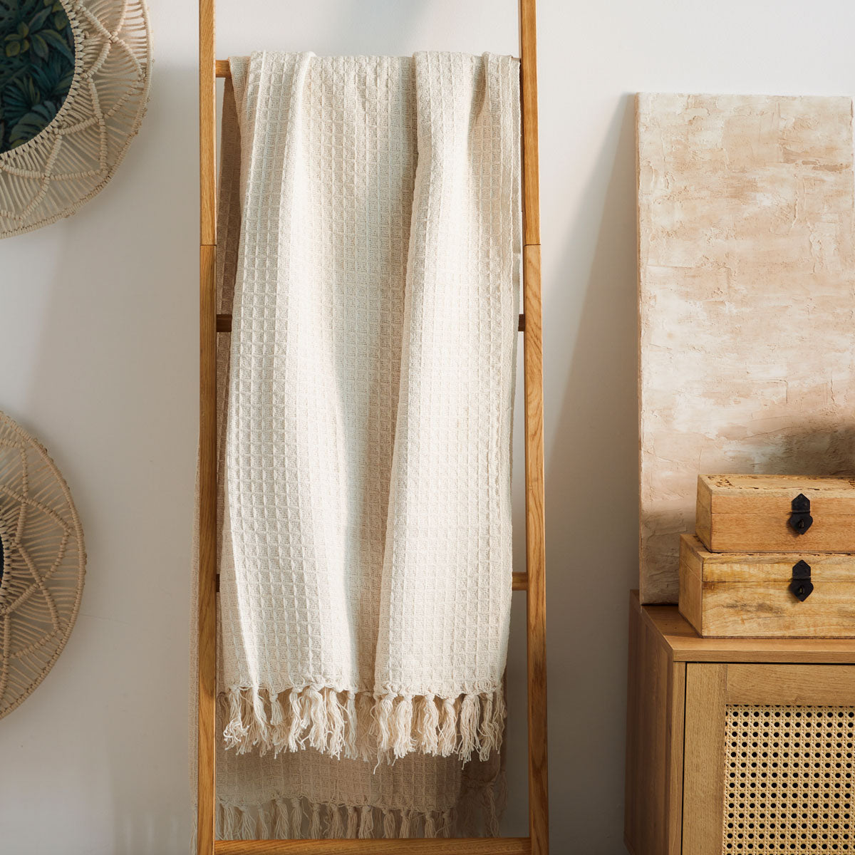 Soft and pleasant to the touch Beautiful geometric weave Soft, calming colours Made of natural cotton Cotton fringed blanket Delightful with its stylish minimalism, the HOMLA VAFFEL blanket is delicately embossed in the form of small squares. The shorter sides of the blanket are decorated with soft tassels for added appeal. Pleasantly soft and airy, it is the perfect blanket to keep you comfortable during chilly evenings spent at home or on the terrace. Purpose The VAFFEL blanket is ideal as a warm body cover, as well as a bedspread or sofa bed. Its dimensions are 130 x 170 cm, so it will also be an excellent decoration for an armchair in the living room. Made in the colour ecru, it will fit perfectly into boho, Scandinavian and bright modern spaces. Material The blanket is sewn from high quality cotton, which permanently retains its softness, strength and colouring.