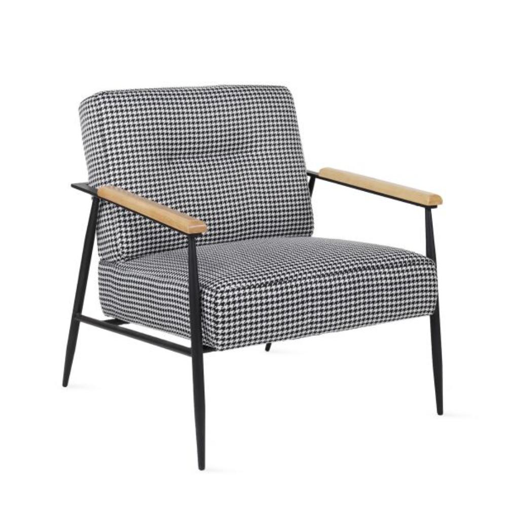 Mid-century modern design Stable metal frame Armrests finished in wood Stylish houndstooth upholstery Living room armchair black and white with houndstooth pattern The HOMLA VELUDO armchair combines the solidity of a metal structure with the high comfort of the seat and backrest. The profiled legs taper downwards, which is one of the most characteristic features of mid-century modern furniture, designed in the 50s and 60s of the twentieth century. However, what distinguishes this armchair the most is the expressive houndstooth upholstery. Wooden armrests in a natural color match the whole perfectly. Destiny The HOMLA VELUDO armchair has compact dimensions, which is why it is a piece of furniture that is comfortable to use, easy to move, move and move. Its design will fit perfectly into modern, loft and boho style interior design. Material The metal frame and legs of the chair are powder coated. The armrests are made of lacquered wood, and the upholstery is made of tear-resistant and abrasion-resistant polyester material. Additional information DIY product Maximum load: up to 120 kg Backrest height: 47.5 cm Seat and backrest connected on special brackets