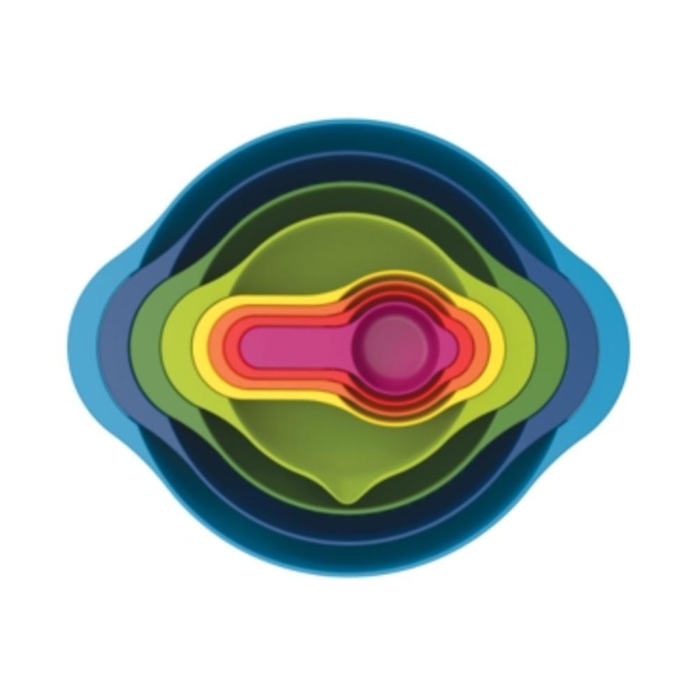 The innovative design of this 8-piece set allows the individual elements to be stacked neatly together, thereby occupying the absolute minimum amount of space. The large mixing bowl has a non-slip base and wide carry handles. The small mixing bowl includes measurements inside for added convenience and a spout for accurate pouring. Measuring cups have been designed to 'snap' together securely and range in size from ¼ cup (60 ml) up to 1 cup (250 ml). The set also includes a large colander.