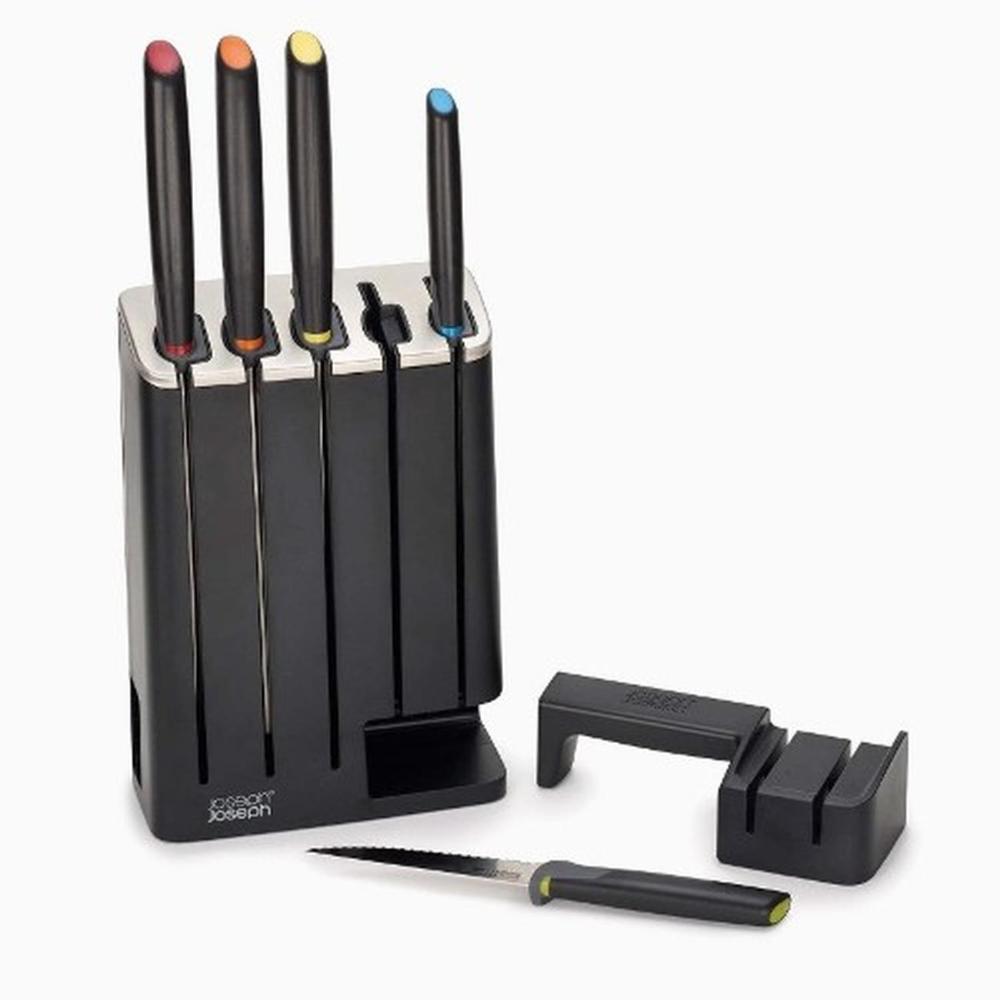 The Elevate™ range of kitchen tools is designed to improve hygiene and reduce mess. Each tool has an innovative weighted handle with an integrated tool rest, ensuring that the head or blade is always raised off the work surface, when placed down. This stylish set comprises five knives with Japanese stainless-steel blades and ergonomic handles plus a smart, slimline knife block. The block features easy-access knife slots and a removable, two-stage ceramic sharpener in the base. Simply push the side of the unit to release the sharpener when required. The sharpener features two ceramic wheels that sharpen and hone the blades, helping to keep them in optimum condition (not suitable for ceramic or serrated blades). After use, simply slide the sharpener back into place where a magnet holds it securely in place.