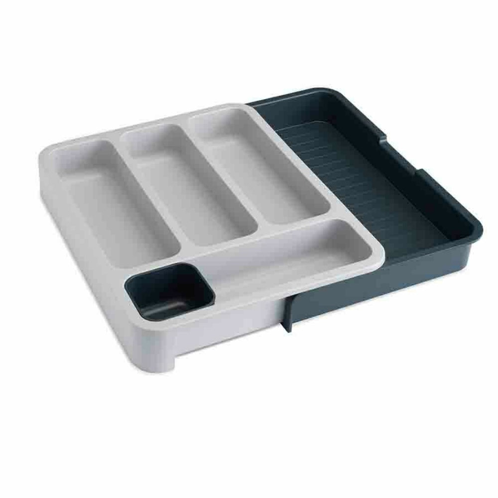 Organise messy cutlery drawers with this practical and smart storage solution. The two halves of the tray can be finely adjusted to fit a variety of drawer sizes and lock securely together once in place. The design provides four deep-sided compartments for holding cutlery, a utensil area for knives or larger kitchen tools and a handy, moveable storage dish for small, loose items. Fits a wide range of drawer sizes from 29 cm up to 48 cm. Wash and dry by hand.