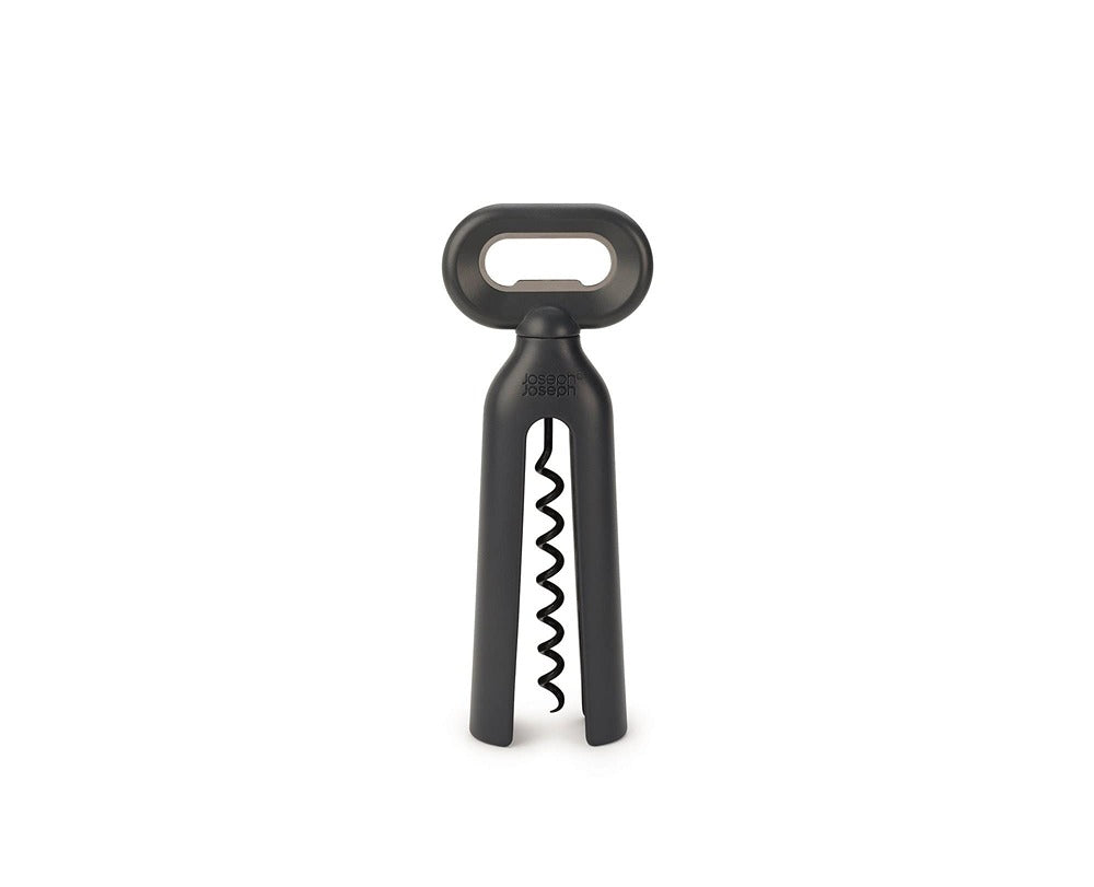 This handy gadget features three bottle-opening tools in one compact design. Firstly, it has an easy-open winding corkscrew with a non-stick thread that glides quickly into any cork. At the base of its arms are four integrated cutters for removing foils. Finally, the handle of the corkscrew also features a bottle-cap opener for prising off metal caps. Color: grey. Box contents: X 1 corkscrew. Care instructions: wipe clean with a damp cloth. Caution: sharp tip, handle with care. Using the corkscrew: 1. Place foil cutters onto neck of bottle, squeeze arms and twist to cut. 2. Remove screw, push holder down over neck of bottle and grip arms. 3. Replace screw into holder, push down and twist clockwise into corkscrew.