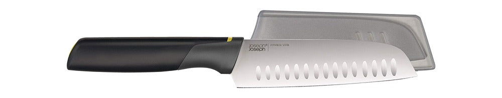 The Japanese Santoku knife will become your favorite helper in food preparation. You can use it to slice any food and use its wide blade to scoop up chopped food. The 14 cm long blade is made of high quality Japanese stainless steel. The ergonomic handle with integrated support, which prevents the blade from touching the work surface when the knife is put down, guarantees comfortable and safe work with the knife. Each knife in this collection comes with a protective plastic blade cover.
