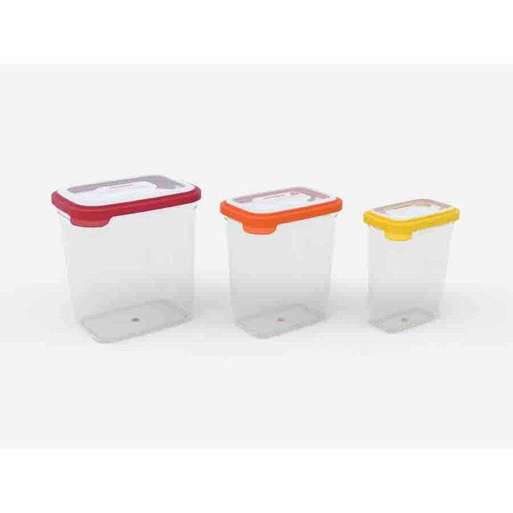 Providing A Colourful And Space Saving Solution, The Clever Design Allows You To Store Multiple Sizes Of Food Container In The Same Space As The Largest. Container Bases Nest Neatly Inside Each Other And Lids Snap Conveniently Together Making Them Very Easy To Find. This 3-Piece Set Features Airtight Lids And Clear Colour Coding For Easy Pairing. Dimensions: 17.8 X 12.8 X 20 Cm. Dishwasher Safe. Food Safe. Bpa Free