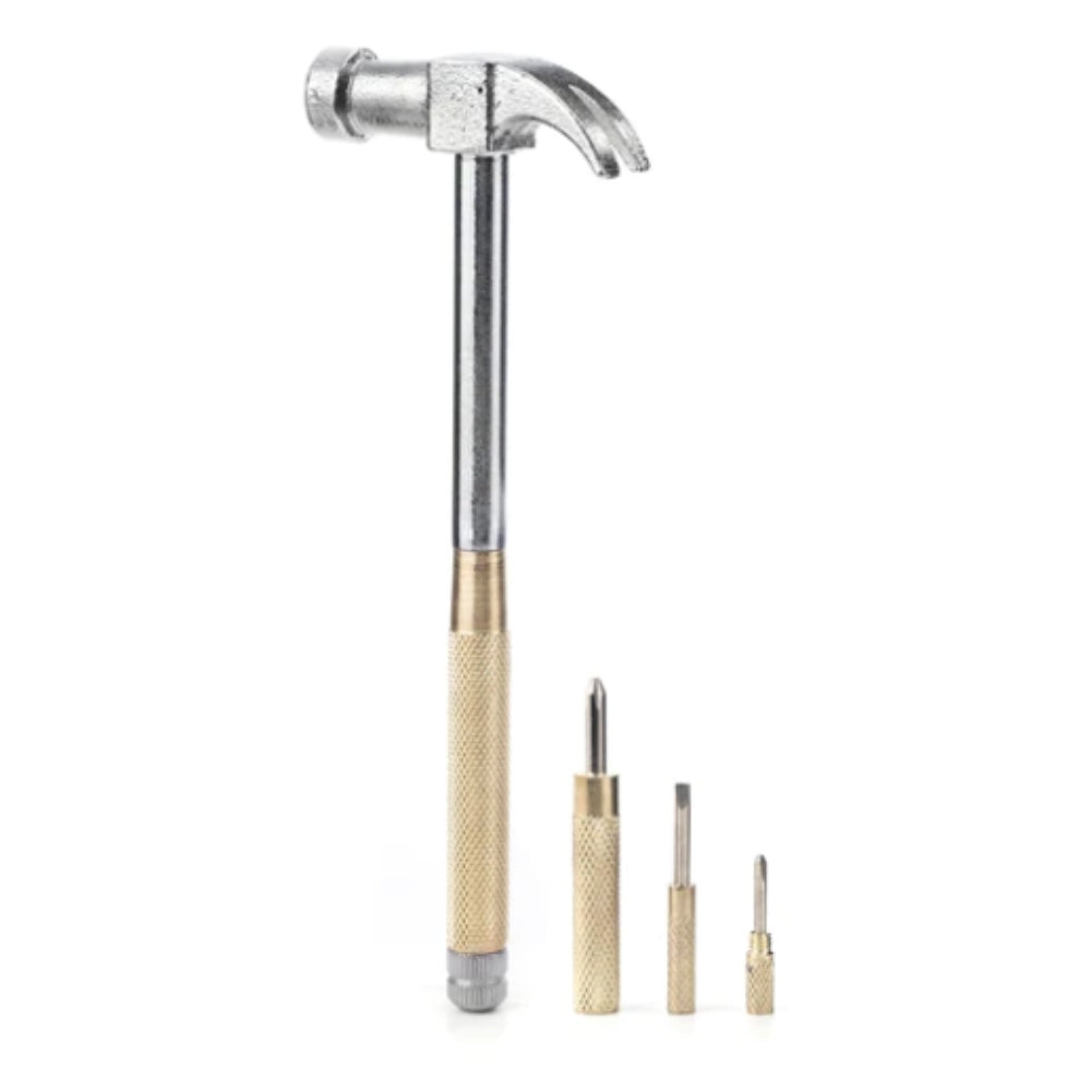 Be ready for any household task with this striking hammer which is also a handy 6-in-1 screwdriver set. The brass handle unscrews to reveal a handsome screwdriver with a rugged grip. Extra driver heads can be stored in the base of the screwdriver. Comes with nickel plated claw hammer head, and two flat head and two Phillips head tips. Material: brass, cast steel product: 19,1cm X 7,1cm X 2,2cm