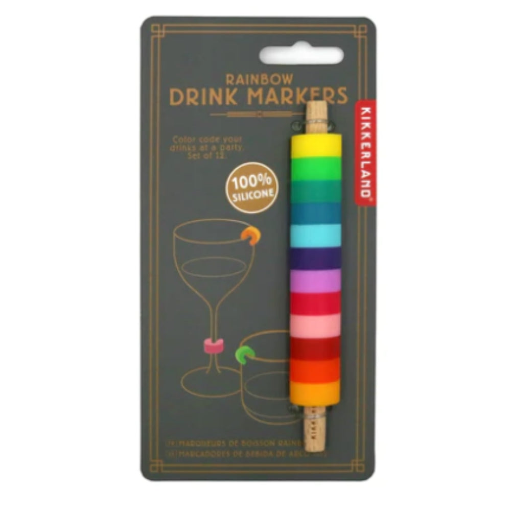Color code your drinks at a party. Set of 12. Material: silicone, beechwood. Product: 12,6cm X 1,7cm X 1,7cm