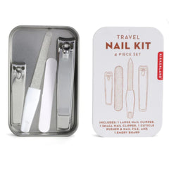 Give yourself a well-groomed look with this Kikkerland Design manicure set. Its easy to travel with and provides everything you need to refine your nails. Large and small nail clippers let you make clean cuts. Emery board makes it easy to smooth out rough edges. cuticle pusher helps you maintain a pristine manicure and pedicure. Includes a storage tin.