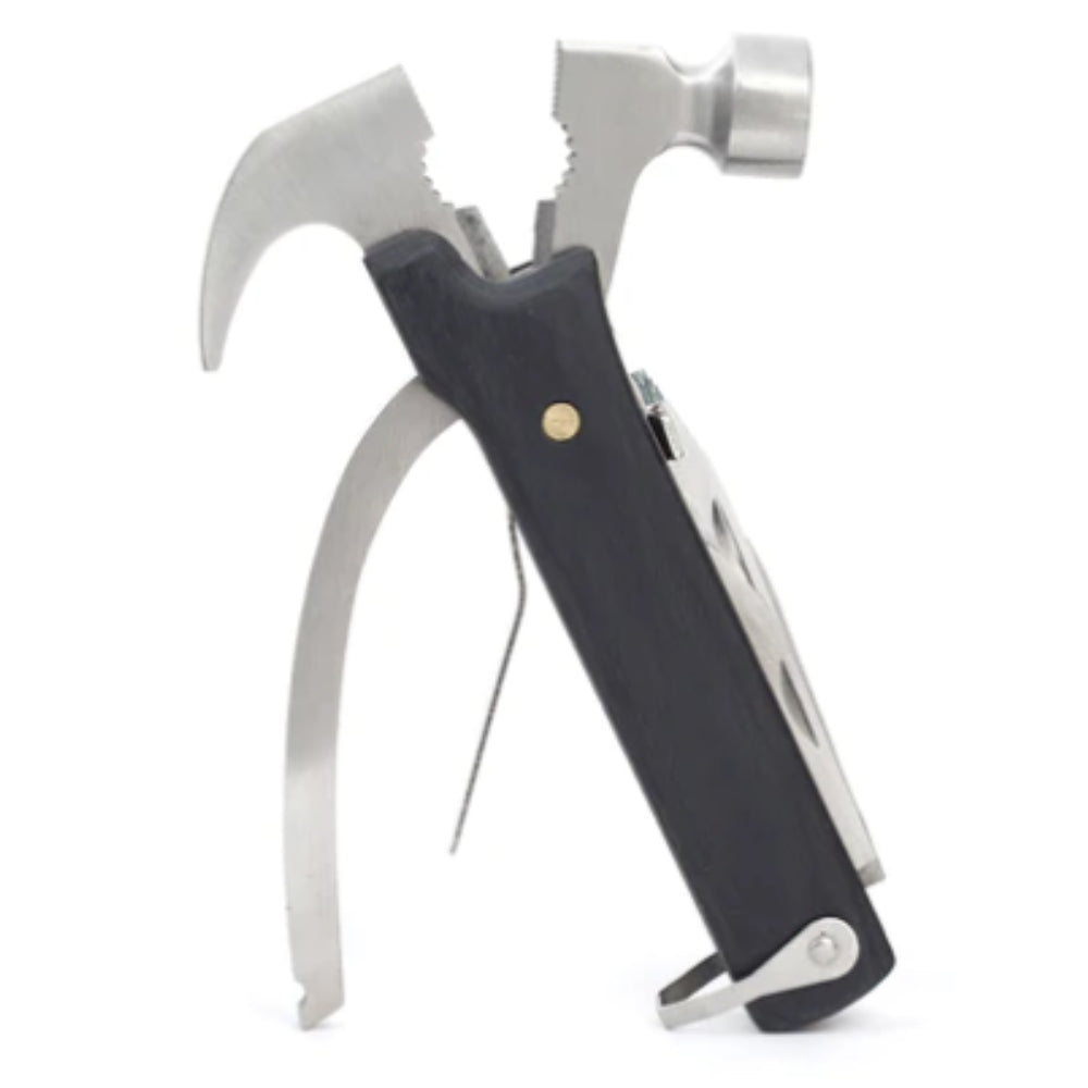 The hammer multi-tool has 10 tools in 1. Tools included: hammer, flat head screwdriver, bottle opener, reamer, saw blade, file, knife blade, phillips head screwdriver, pliers and wire cutters material: stainless steel, stained wood. Product: 14cm X 7,7cm X 1,8cm