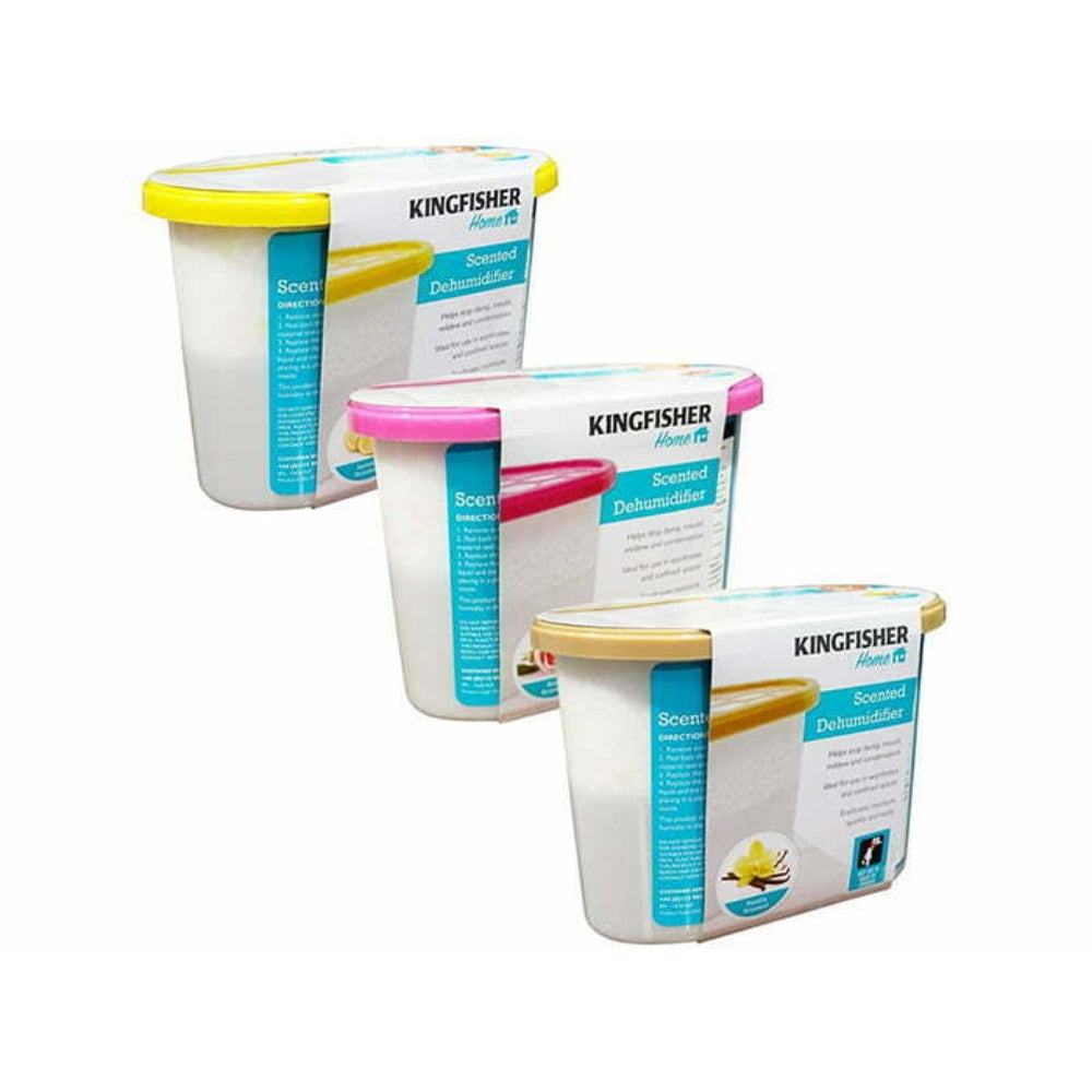 Scented compact dehumidifier and moisture absorber complete with crystals. Lemon, rose or vanilla fragrance. Ideal for window sills, under sinks, cupboards and sheds. Absorbs up to 3 times its own weight.