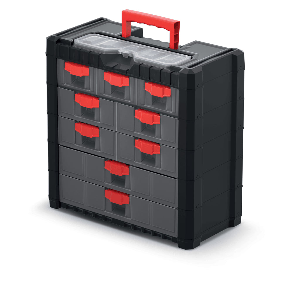 "MULTICASE CARGO ORGANISER 50 KMC501 - Ergonomic handle - Organiser in the lid - 3 small, 4 medium and 2 large drawers - Locks to protect the drawers from falling out - Body made of a mixture of increased strength polymers"