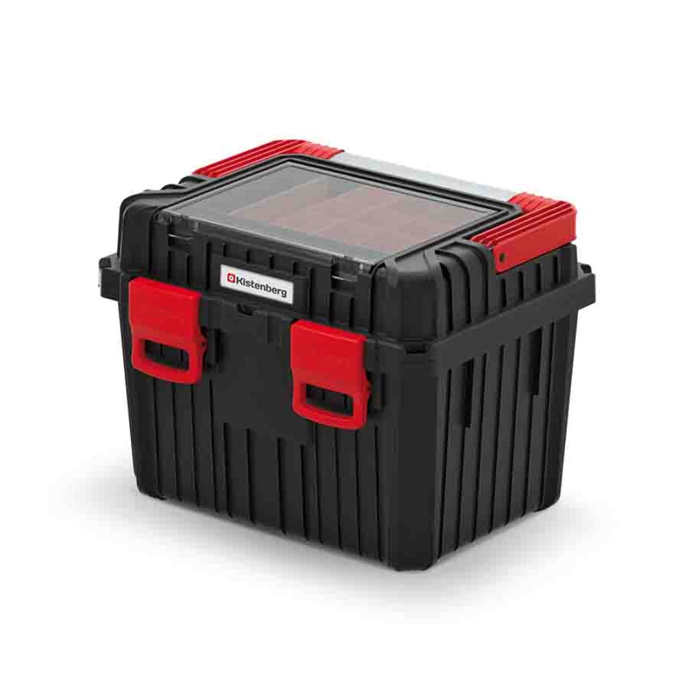 Body made of a reinforced polymer blend. Reinforced wall structure. Durable large aluminum handle. Durable ABS clasps. Solid gasket ensures dustproof and water resistance. Functional carrier inside. Large transparent organizer with a polycarbonate lid. Partitions and cups in the organizer. Load capacity 30kg. Dimensions: 445 x 360 x 337 mm.