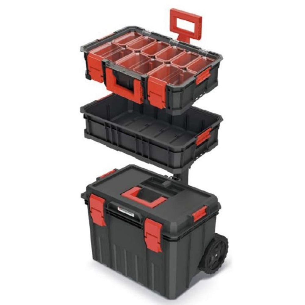 The MODULAR SOLUTION modular set includes a trolley equipped with a handle for easy lifting, three removable compartments, one of which is also a multifunctional transport box for hand tools, a telescopic handle and wheels with elastomer tread. Another product included in the set is a tool box equipped with a handle, durable ABS buckles and two removable compartments located inside the box. The last product that belongs in the set is an organizer with a polycarbonate lid and removable crates.