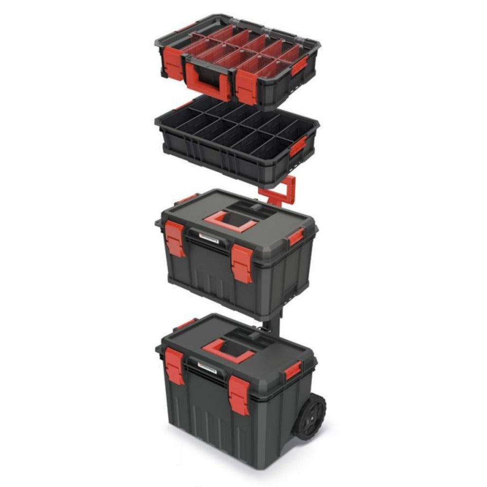"The MODULAR SOLUTION modular set includes a trolley equipped with a handle for easy lifting, three removable compartments, one of which is also a multifunctional transport box for hand tools, a telescopic handle and wheels with elastomer tread. Another product included in the set is a tool box equipped with a handle, durable ABS buckles and two removable compartments located inside the box. The last product that belongs in the set is an organizer with a polycarbonate lid and removable crates."