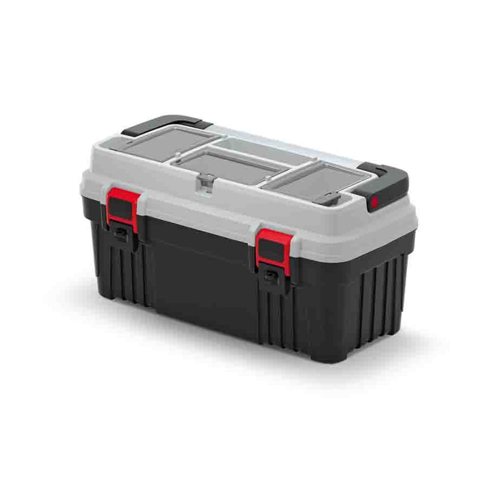 OPTIMA TOOLBOX 55 KOPA5530 - Length - 540 mm - Long aluminium handle - 3 organisers in the lid - Transparent lid of the organiser made of durable polycarbonate - Tray with space for bits - Body made of a durable mixture of polymers - Durable ABS and elastomer latches - Load capacity up to 20 kg - The lid of the fully opened toolbox can be supported on the ground by its aluminium handle to convert the toolbox into a work surface.
