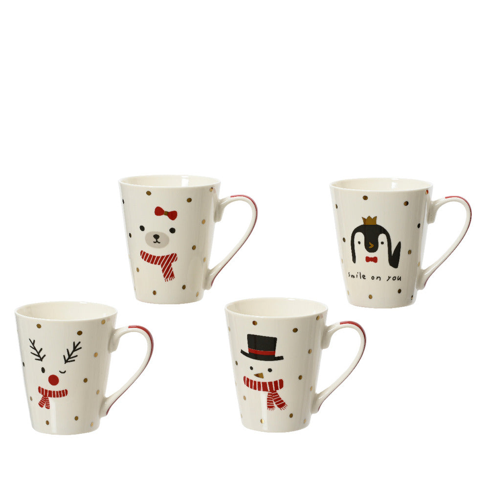 Porcelain mug in white with 4 assortment of cute designs: bear, penguin, reindeer and snowman.