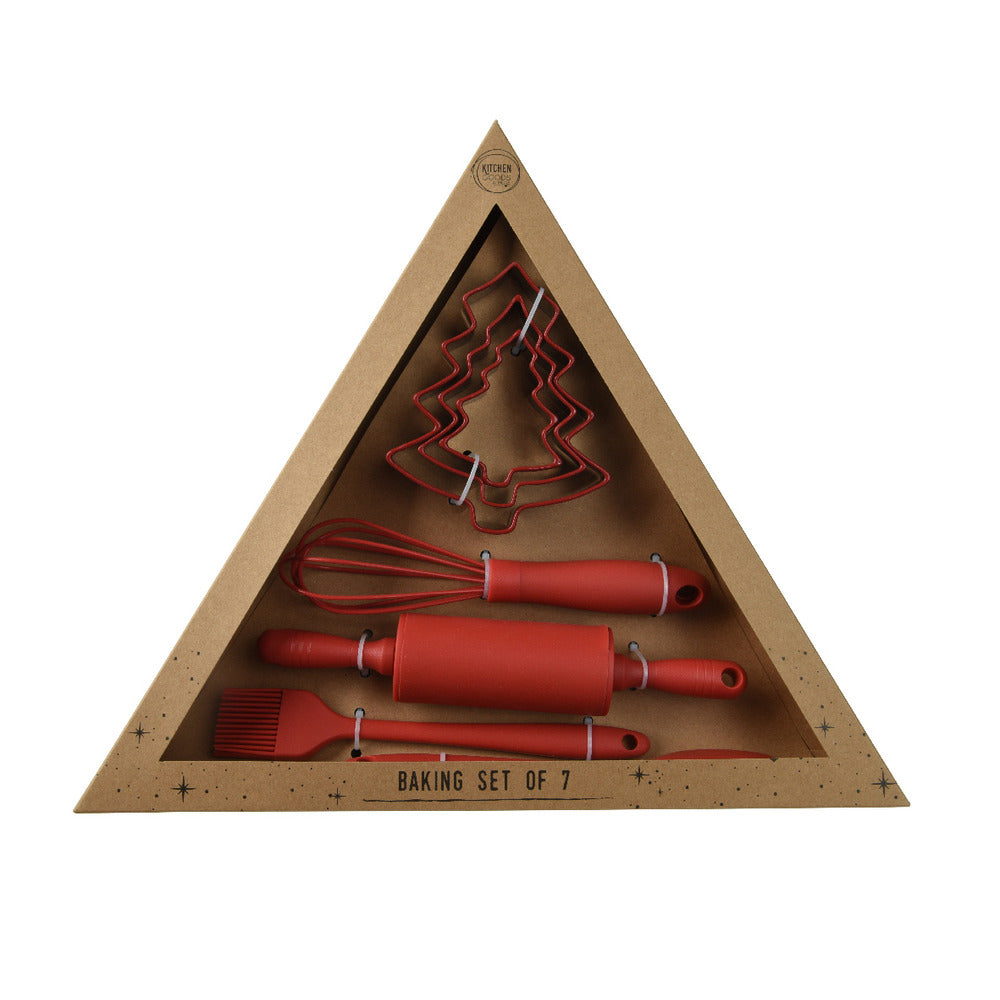 Silicone Baking Set of 7 Pieces: 3 cookie cutter with Christmas tree design, whisk, rolling pin, brush and scraper.