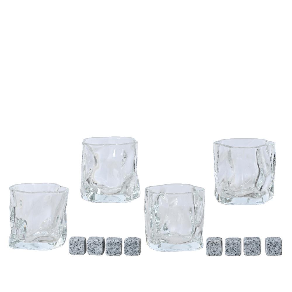 Whiskey glass set of 4 with 8 ice cubes. Great idea for a gift.
