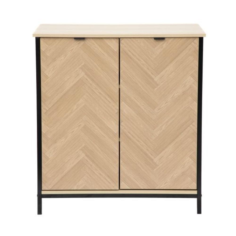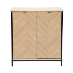 Stable construction Spacious cabinet with shelves Handy, discreet handles Durable, high-quality materials Chest of drawers for the bedroom or living room on metal legs The stylish HOMLA SWEN chest of drawers is a unique combination of functionality and modern design. The fronts of the furniture are distinguished by their original pattern, which resembles a classic herringbone pattern. The natural colour of the wood has been enlivened with a black metal frame, which introduces a loft-like accent. Thanks to this, the chest of drawers will be a perfect complement to modern arrangements. The capacious cupboard conceals shelves on which you can place any objects, ensuring order and tidiness in the room. The top of the chest of drawers can be used to display decorative accessories, flowers and favourite photographs. Purpose The SWEN chest of drawers may be placed in the living room, bedroom, hallway or home office. It will be perfect for storing clothes, tableware, documents or seasonal decorations. We have equipped the doors of the cabinet with handy yet discreet handles that make it easy to open. The chest of drawers will perfectly fit into selected arrangements in loft, industrial and eclectic styles. Material The chest of drawers is made of MDF, which is characterised by its durability. The furniture is set on metal legs, which have been powder-coated, making them aesthetically pleasing and resistant to corrosion Additional information Do-it-yourself productHeight of the feet: 8.3 cm’.