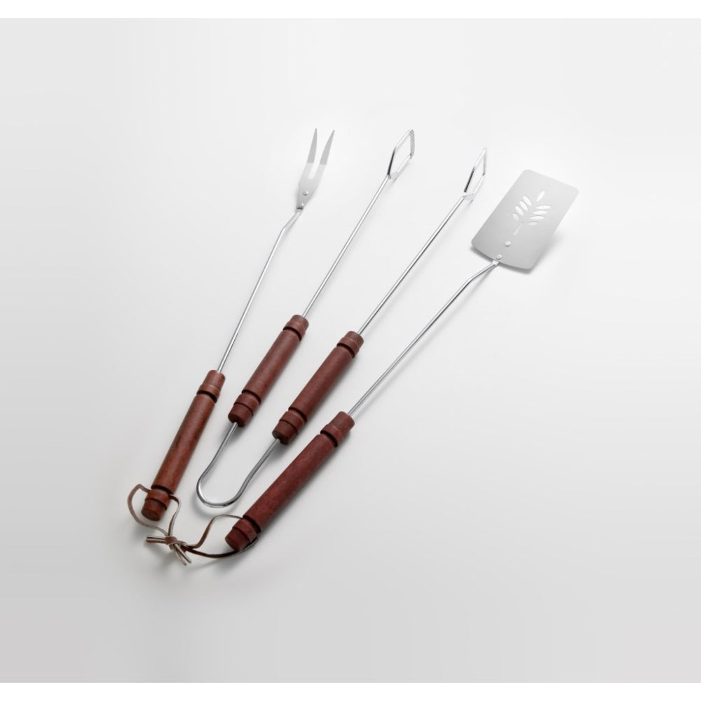 - 3-piece set, consisting of a fork, spatula and tongs with wooden handles. - chrome-plated. - length 47 cm.