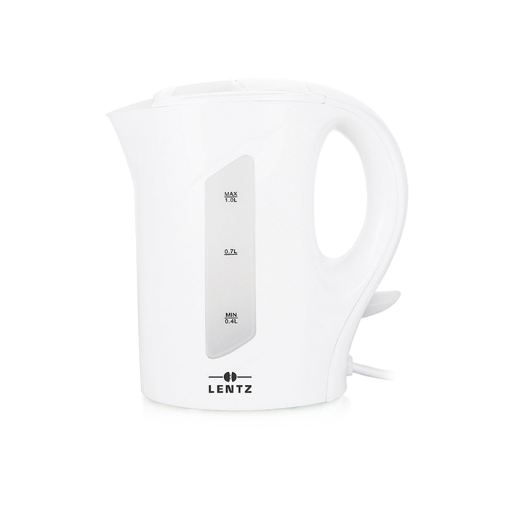 Plastic kettle with safety locking lid and automatic and manual shut-off. GS tested safety, 220-240 V 50-60HZ 750-900 W Color note: Due to the different screen settings, slight color deviations are possible. Function: Automatic and manual switch-off, overheating and dry-running protection. All specifications are approximate dimensions - Usable capacity: 1L Water level indicator: outside Set size (parts): 1 -piece Power: 750-900W Width: 19,5cm Depth: 10,7cm